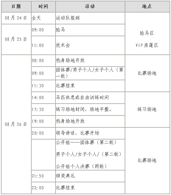 各參賽隊: 現(xiàn)將2012年全國繞桶冠軍賽(達(dá)拉特旗站)參賽事宜通知如下。 一、比賽日期和地點 比賽日期調(diào)整為2012年08月25-26日,比賽地點為鄂爾多斯達(dá)拉特旗市政廣場。 二、報到地點 鄂爾多斯達(dá)拉特旗市政廣場——比賽場地。 三、收費標(biāo)準(zhǔn) 組委會負(fù)責(zé)為每個參賽隊提供2個標(biāo)準(zhǔn)間(共4個床位)的住宿費用。其它費用各隊自理。 相關(guān)收費標(biāo)準(zhǔn)如下: (一)住宿費:客房260元/單間(兩人間) (二)馬廄費:由組委會免費提供臨時馬廄 (三)草料費:100元/捆。 四、其它 (一)各代表隊人員及騎手報到后,必須遵守大會安排的訓(xùn)練時間和場地進(jìn)行訓(xùn)練。 (二)驗馬請攜帶中國馬術(shù)協(xié)會馬匹護(hù)照。如沒有,請于抵達(dá)賽區(qū)前向中國馬協(xié)申請辦理。 五、賽事接待 接待處:李可為 電話:13401043080 馬房部: 徐文魁 電話:15847072156 二〇一二年八月二十一日 |