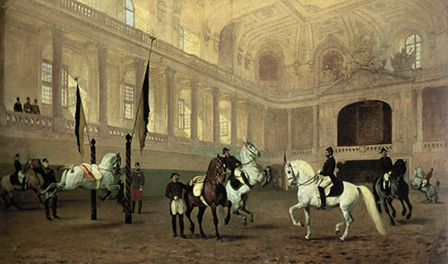 朱利葉斯·馮·布拉斯(1845-1923) 創(chuàng)作于1890年,木材油畫62*99cm 收藏于維也納文化歷史博物館 在中世紀(jì)時期,古典馬術(shù)訓(xùn)練逐漸演變?yōu)閼?zhàn)馬訓(xùn)練。戰(zhàn)馬必須被訓(xùn)得快速、可控,并且兩條后腿要能向后方蹬踢。當(dāng)時這種訓(xùn)練形式有著自己獨(dú)特的制度,為此還成立了馬術(shù)學(xué)院以迎合人們對這種騎術(shù)學(xué)習(xí)的需求。從國王到貴族,人們都希望能有更多這種高等學(xué)院,這樣騎士就可以擁有更高的地位。 1572年,維也納成立了西班牙皇家馬術(shù)學(xué)校,并且在1729年至1735年,卡爾大帝六世命巴洛克式建筑師埃拉褐建造了金碧輝煌的馬術(shù)表演大廳,這幅畫畫的就是它的內(nèi)部場景。這所馬術(shù)學(xué)校是近400年來世界上唯一一所始終以傳統(tǒng)的形式練習(xí)并演繹古典馬術(shù)的機(jī)構(gòu)。關(guān)于西班牙皇家馬術(shù)學(xué)校的歷史,利比扎納博物館有著詳細(xì)的記載。 西班牙馬術(shù)學(xué)校的訓(xùn)練馬只使用利比扎馬,這是一種兼有西班牙、那不勒斯和阿拉伯血統(tǒng)的馬,早先來自利比亞。它們出生時是淺黑色,大約長到7歲時才具有這種耀眼的白色。每天奧地利騎士們都會同它們一起訓(xùn)練。在這張畫上的中間是王子埃默里?!ゑT·圖恩和塔克西斯,而旁邊的騎士正在訓(xùn)練馬跳越障礙。 |