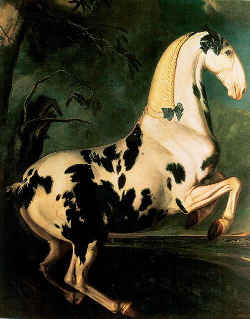 約翰·喬治·馮·漢密爾頓(1672-1737) 創(chuàng)作于 1700 年,木材油畫 260.4*211cm 列支敦士登博物館,瓦杜茨 - 維也納親王收藏 漢密爾頓是十八世紀(jì)一名勤奮的編年史作家,專寫古典訓(xùn)馬術(shù)。在這幅畫中他畫了一匹健碩有力的種公馬,它可以自由優(yōu)雅地參加盛裝舞步比賽。這匹幾乎與真馬同等大小的花斑種馬肖像畫原本是漢密爾頓在公元 1700 年創(chuàng)作的 6 副系列馬畫的一部分,用來裝飾在維也納的羅騷新建的列支敦士登夏宮。七年后,風(fēng)景畫家安東·法伊斯滕貝格奉命在其中的四幅油畫中插入背景。通過風(fēng)景圖畫背景的支撐,花斑馬起揚(yáng)的動(dòng)作顯得更具動(dòng)態(tài)感。漢密爾頓不僅試圖描繪動(dòng)物的美,還注重肖像的意義和性格的表達(dá)。 畫面中的這匹花斑馬是一匹來自列支敦士登的伊斯格魯布種馬場(chǎng)的種公馬。該種馬場(chǎng)是由卡爾·尤西比烏斯王子(1611 年至 1684 年)所創(chuàng)立。他的馬房目前擁有 120 匹不同品種的種馬,在歐洲享有盛譽(yù)。起源于西班牙的馬,不管是生理還是心理,都是最符合古典馬術(shù)嚴(yán)格要求的馬種。盡管如今的人們?cè)谔岬竭@種藝術(shù)形式時(shí),大多想到的是傳統(tǒng)的白色利比扎馬。但在十八世紀(jì),很多西班牙馬都是單色或者帶有斑點(diǎn)的毛色,并且在當(dāng)時(shí)很是時(shí)髦。 |