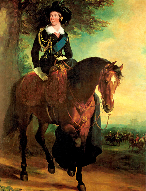 弗朗西斯 ? 格蘭特(1803-1878) 創(chuàng)作于 1840 年,木材油畫(huà) 目前儲(chǔ)藏于倫敦陸海軍下級(jí)軍官俱樂(lè)部 蘇格蘭畫(huà)家弗朗西斯 ? 格蘭特曾任皇家學(xué)院的校長(zhǎng),多次為維多利亞女王畫(huà)像,同時(shí)也為許多杰出的英國(guó)貴族和政治人物畫(huà)像。在這張畫(huà)像上,年輕的女王從容優(yōu)雅地騎在棕色的坐騎上,這也是最能展現(xiàn)她美麗的畫(huà)作之一。身后的寢宮及城堡在向世人展示著她的地位,皇室權(quán)威的形象在此顯露無(wú)疑。此畫(huà)中,女王得體優(yōu)雅的儀態(tài)舉止與放松的氛圍協(xié)調(diào)一體,流露出了女王內(nèi)心深處平易近人的一面。 畫(huà)中的維多利亞女王坐在女士馬鞍上,在現(xiàn)實(shí)中,女王也非常愛(ài)馬并且熱衷于賽馬。據(jù)說(shuō)有一次她與叔叔威廉四世賽馬,最后還贏了叔叔一匹馬。還有一次,在觀看阿斯科特的賽馬比賽時(shí),女王曾激動(dòng)得想要試著親自參加決賽,竟然將皇室包廂的窗戶(hù)打破了。英國(guó)皇室一直熱衷于馴養(yǎng)馬匹,尤其喜歡賽馬運(yùn)動(dòng),這一傳統(tǒng)他們?nèi)员A糁两瘛?/div> |