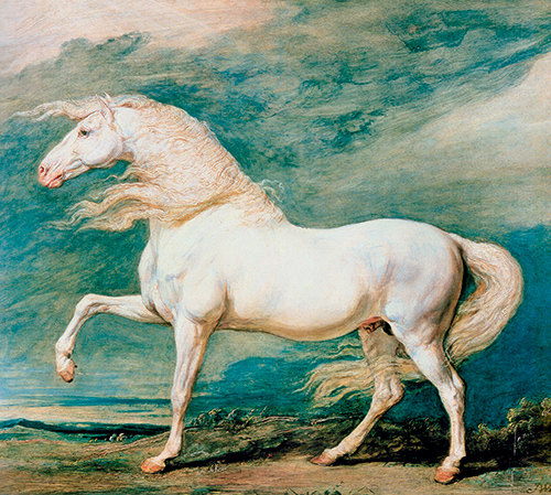 詹姆斯·沃德(1769-1859) 白色種馬阿多尼斯,木材油畫 現(xiàn)為私人收藏 這匹白色種馬叫阿多尼斯,是大不列顛及愛爾蘭聯(lián)合王國的國王喬治三世(George III,1738-1820)最喜歡的一匹軍馬。喬治三世國王好武,一生征戰(zhàn)無數(shù),在位59年。統(tǒng)治期間,大不列顛在七年戰(zhàn)爭中擊敗法國,并使大不列顛壓倒歐洲各國,成功支配著北美洲及印度地區(qū)。 沃德在這幅畫中展現(xiàn)出了軍馬阿多尼斯無所畏懼、充滿英雄氣概的浪漫主義色彩。白馬與遠(yuǎn)處地平線上風(fēng)雨如磐的天空形成強(qiáng)烈的色彩對(duì)比,同時(shí)也形成了真實(shí)與虛幻的對(duì)照,使得白馬的形象更加突出立體。 詹姆斯·沃德所畫的《白色種馬》,與喬治·斯塔布斯繪制的《獅子與馬》的系列之間形成了一個(gè)有趣的對(duì)比。從馬的角度來看,盡管此幅圖畫上繪制了一些陰暗的元素,但在結(jié)構(gòu)和整體效果上還是表現(xiàn)得很完整的。沃德和藝術(shù)家索里·吉爾平(1733-1807)以斯塔布斯的畫為樣本,還畫了一幅《驚恐的馬》,該畫展現(xiàn)的是一個(gè)略帶恐怖與戲劇性的主題。當(dāng)一匹馬以簡潔的形象出現(xiàn)在世人面前時(shí),就迅速得到了人們的喜愛。 |