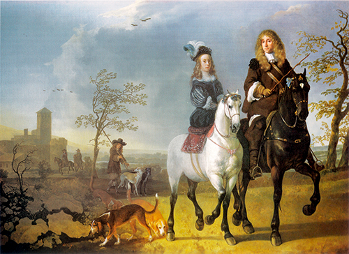 阿爾伯特·克伊普(1620-1691) 馬背上的夫人和紳士,布面油畫 私人藏品 1620年,阿爾伯特·克伊普出生在荷蘭西南部港口城市——多德雷赫特??艘疗帐歉缂t的藝術世家的后人,他的父親是多德雷赫特市有名的雕塑家,他的爺爺也是擁有卓越成就的玻璃畫家,他的叔叔以宗教、牧民以及小酒館為主題的創(chuàng)作作品聞名遐邇??艘疗盏母赣H一心想培養(yǎng)兒子走上藝術之路,供他讀昂貴的藝術院校。雖然當時的多德雷赫特并不以藝術知名,但作為一個有著深厚文化底蘊的老城,港口貿(mào)易的發(fā)達,讓這里成為了荷蘭的經(jīng)濟中心,消費水平之高是屈指可數(shù)的??艘疗漳贻p時候常常在父親的雕塑工作室?guī)兔?,不久后就開始獨立探索自己感興趣的畫作風格。 1658年,克伊普38歲,迎娶了他的夫人,一位富商的遺孀,他的妻子與前夫生養(yǎng)了三個孩子?;楹蟮目艘疗諏^子呵護有加,承擔著一位父親應盡的義務,他沒有更多的時間繪畫,筆下的作品越來越少。然而,他并不為生計發(fā)愁,他是一位富有的畫家,創(chuàng)作純粹為了興趣,而不是為了銷售。 這幅《馬背上的夫人和紳士》完成于1655年,展現(xiàn)了作者克伊普的繪畫風格,對馬匹的描繪更是體現(xiàn)了 17 世紀盛行的荷蘭式藝術風格的特點。畫面中的夫人與紳士也許是一對夫妻,正要騎馬外出打獵。對于這對夫婦的身份后人曾有很多種說法,其中最可信的身份是克伊普贊助人的愛女與女婿。且看這位夫人身著華麗的藍色裙裝,她所策騎的白馬佩戴耀眼的紅色鑲著金邊的鞍墊,新婚的夫君深情地望向愛妻,一切看起來都是那么完美,仿佛紀念著克伊普所有美好的回憶。若你觀察主人策騎的馬匹的細節(jié),就不難發(fā)現(xiàn)馬匹的頭部與身體的比例并不協(xié)調,也許克伊普擔心馬匹在畫作中的漂亮外形會讓觀者忽視了騎乘馬匹的夫人與紳士,盡量試著去避免喧賓奪主。 |