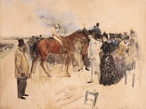 讓 - 路易·弗朗(1852-1931) 多維爾賽馬,水彩畫(huà) 私人藏品 弗朗的畫(huà)作展現(xiàn)出了水彩畫(huà)中少有的精致與唯美,在他的作品中對(duì)法國(guó)速度賽馬盛行時(shí)期的畫(huà)面捕捉,格外生動(dòng)逼真,并富有獨(dú)特的韻味。弗朗出生在法國(guó)東北部的城市蘭斯,在他8歲的時(shí)候,隨家人一起遷居巴黎。成年后,他開(kāi)始人生中的第一份事業(yè),為在巴黎享譽(yù)盛名的兩家期刊機(jī)構(gòu)擔(dān)任漫畫(huà)作家。之后,一心求學(xué)的弗朗獲得了巴黎藝術(shù)學(xué)院進(jìn)修深造的機(jī)會(huì),并在兩位藝術(shù)大師讓 - 里奧·杰洛姆和讓 -巴蒂斯·卡爾波的指導(dǎo)下苦心孤詣,獲得了極高的藝術(shù)成就。很快地,弗朗運(yùn)用自己的聰明才智擴(kuò)充了朋友圈,結(jié)交了很多有才華的詩(shī)人與畫(huà)家。 1879年,弗朗的繪畫(huà)風(fēng)格開(kāi)始偏向印象主義流派。這是19世紀(jì)后半期形成于法國(guó)的一個(gè)重要的繪畫(huà)運(yùn)動(dòng),印象主義畫(huà)家講究實(shí)際,力圖客觀地描繪視覺(jué)現(xiàn)實(shí)中的片刻。弗朗的代表作也在 1879 至1884的幾年間3次成功展出,在藝術(shù)界具有深遠(yuǎn)的影響。受印象主義畫(huà)派的影響,弗朗對(duì)作品中表現(xiàn)出物體的色彩變化有極高的要求,畫(huà)作還必須反映出光線、周?chē)h(huán)境對(duì)物體色彩的影響。他更傾心于描繪日常生活中普通的場(chǎng)景,他用水彩顏料或蠟筆勾勒出的畫(huà)作無(wú)不以巴黎極具流行元素的娛樂(lè)活動(dòng)為主題,最常見(jiàn)的內(nèi)容有賽馬場(chǎng)、芭蕾舞、歌劇院以及別具一格的咖啡館。 第一次世界大戰(zhàn)期間,弗朗的作品中傳遞出的愛(ài)國(guó)主義精神受到了業(yè)界的尊重,而與他同齡的藝術(shù)家的創(chuàng)作中,這種愛(ài)國(guó)主義情結(jié)的體現(xiàn)是少有的。他在晚年創(chuàng)作了很多關(guān)于法庭、巴黎政府機(jī)構(gòu)以及19世紀(jì)末20世紀(jì)初社會(huì)風(fēng)氣的譏諷漫畫(huà)。1931年,在弗朗去世之前,他成為了倫敦皇家藝術(shù)學(xué)院的會(huì)員。在弗朗生前數(shù)以萬(wàn)計(jì)的作品中,對(duì)巴黎城市生活的真實(shí)寫(xiě)照讓他的光輝形象被后人深深銘記,很多弗朗的追隨者無(wú)不仰慕他的才華。也正因如此,弗朗成為了法國(guó)最有知名度、最受尊敬的藝術(shù)家之一。 這幅《多維爾賽馬》以法國(guó)著名的賽馬場(chǎng)為創(chuàng)作背景,透過(guò)熙熙攘攘的人群,我們會(huì)不由得聯(lián)想到法國(guó)興盛的馬業(yè),觀看賽馬甚至成為法國(guó)上流社會(huì)的達(dá)官顯貴互通有無(wú)的一個(gè)重要契機(jī)。畫(huà)中還為我們呈現(xiàn)了容色妍麗的女士們,身著為賽事精心定制的禮帽及時(shí)裝同男賓一同出席賽馬活動(dòng),這種引領(lǐng)法國(guó)時(shí)尚潮流的穿戴恰恰證明了法國(guó)人與生俱來(lái)的浪漫情致和對(duì)賽馬文化的熱愛(ài)。 |