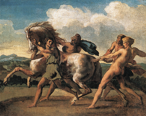 泰奧多爾·席里柯(1791-1824) 奴隸與馬的較量,布面油畫。 私人藏品 泰奧多爾·席里柯(1791-1824)出生在法國諾曼底,是19世紀(jì)初期法國浪漫主義畫派的先驅(qū),他的眾多代表作均以馬為主角。可以說,在法國這樣一個(gè)終日氳氤著香水氣味的城市,畫家的成長會(huì)更為精致。作為頗有經(jīng)濟(jì)頭腦的法學(xué)家的兒子,18歲的席里柯中學(xué)畢業(yè)后即進(jìn)入當(dāng)?shù)刂嫾铱枴ぞS爾內(nèi)的畫室,不覺間決定了一生的事業(yè)。而與父親的期望恰恰相韙,這似乎是不可違拗的天才的命運(yùn)。 通常,純?yōu)樗囆g(shù)的藝術(shù)家總是貧困的,然而席里柯卻擁有一個(gè)富足的家庭,并不為金錢煩惱。年輕時(shí),他是一名兢兢業(yè)業(yè)、嚴(yán)謹(jǐn)教學(xué)的美術(shù)老師,可惜他的才華并沒有得到校方和學(xué)生的認(rèn)可。心中對(duì)藝術(shù)的渴望,讓他毅然決然離開了課堂,選擇去巴黎留學(xué)。留學(xué)期間,他很幸運(yùn)地在凡爾賽宮汲取靈感,開始了自己的創(chuàng)作之路。偶然的一次機(jī)會(huì),他發(fā)現(xiàn)了凡爾賽宮皇家馬廄,自幼就喜愛馴馬表演的他很快就被這里所深深地吸引,也獲得了有關(guān)馬匹解剖及馬術(shù)行為學(xué)方面的專業(yè)知識(shí),從此與馬結(jié)下了深深的緣分。 席里柯畫馬的作品達(dá)千幅,他在用自己的方式表達(dá)對(duì)馬的癡愛。然而,他一生與馬相伴的生活并未持續(xù)多久,慢性結(jié)核的病痛無情地吞噬著他日漸衰退的體力和精力。緊接著,這種痛苦在一次騎馬訓(xùn)練中終結(jié),他不幸墜馬身亡,享年33歲。 《奴隸與馬的較量》的創(chuàng)作靈感,來源于席里柯 1816 年之后的生活經(jīng)歷。那一年,拿破侖在法國發(fā)動(dòng)的戰(zhàn)爭宣告失敗,面對(duì)處于戰(zhàn)亂中的故鄉(xiāng),他選擇了離開,并在意大利羅馬定居。在羅馬,他領(lǐng)略到了異國風(fēng)情的魅力,也平生第一次觀賞到羅馬狂歡節(jié)中著名的表演項(xiàng)目“裸馬賽會(huì)”(指沒有騎手參與的賽馬活動(dòng))。壯觀的表演場面再次激發(fā)他創(chuàng)作了一系列以“表現(xiàn)人類與馬之間力量與控制”為主題的畫作,這幅作品就是當(dāng)時(shí)具有代表性的主題創(chuàng)作。畫作于 1817 年面世,是席里柯早期的成名作品。它直觀清晰地表達(dá)了歐洲原始部落的奴隸掌控馬匹的方式,還借助富有張力的躍馬動(dòng)作和奴隸們生動(dòng)的造型,間接地使讀者身臨其境地感受到畫家在創(chuàng)作畫作時(shí)的動(dòng)蕩不安、沉郁苦悶的內(nèi)心世界。 |