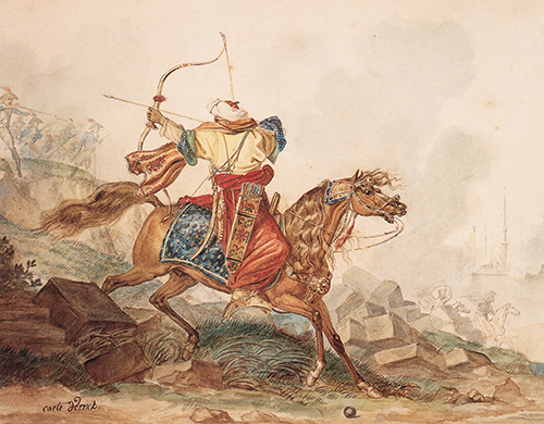 卡爾勒·韋爾內(nèi)(1758-1836) 開弓射箭的馬穆魯克騎兵,水彩畫。 現(xiàn)由美國弗吉尼亞州阿珀維爾的保羅·梅隆夫婦私人收藏 卡爾勒·韋爾內(nèi)出生在法國波爾多的一個(gè)藝術(shù)世家,他的爸爸約瑟夫·克勞德·韋爾內(nèi)是早期著名的油畫大師??柪铡ろf爾內(nèi)延續(xù)了家族的藝術(shù)基因,子承父業(yè),并青出于藍(lán)而勝于藍(lán),年僅 24 歲便贏得法國國家藝術(shù)獎(jiǎng)學(xué)金“羅馬大獎(jiǎng)”,該獎(jiǎng)項(xiàng)獲得者可以得到法國國王資助,前往藝術(shù)之都羅馬進(jìn)行深造。他年輕時(shí)一度熱衷法國大革命,在每個(gè)靈感迸發(fā)的時(shí)刻,總是能創(chuàng)作出令世人稱贊的佳作。在革命后期,因其大氣磅礴的畫作風(fēng)格,他深得拿破侖賞識。直到1808年,50歲的韋爾內(nèi)被拿破侖授予“法國榮譽(yù)軍團(tuán)勛章”,并在之后成為了國王路易十七的御用畫家。 韋爾內(nèi)還有另外一個(gè)身份——狂熱的馬術(shù)愛好者。他對馬術(shù)的這份熱情不停地通過筆下的畫作傳遞,他的作品里展現(xiàn)了馬匹在各種狀態(tài)下的颯爽英姿,諸如賽馬、狩獵或者戰(zhàn)爭中馬的肖像,畫面細(xì)膩而張揚(yáng),情緒渲染力極強(qiáng)。他藝術(shù)造詣極深,擅長油畫、水彩畫和石版畫。在后期的作品里,韋爾內(nèi)創(chuàng)作了大量展現(xiàn)當(dāng)時(shí)市井風(fēng)俗的版畫,描繪了彼時(shí)法國的馬匹交易市場以及人情百態(tài)。 這幅作品,為我們呈現(xiàn)了埃及馬穆魯克騎兵征戰(zhàn)沙場時(shí)的勇猛形象。馬穆魯克騎兵也稱奴隸兵,因其早期的騎兵大多是被奴隸販子強(qiáng)制販賣至中東地區(qū)后成為雇傭兵,由此而得名。到拿破侖時(shí)代,馬穆魯克騎兵隊(duì)逐漸發(fā)展為一支令人聞風(fēng)喪膽的軍隊(duì),創(chuàng)立并鞏固了馬穆魯克貴族的統(tǒng)治地位。值得一提的是,所有的馬穆魯克騎兵都沒有結(jié)婚,他們擁有下一代的方式是通過有償購買俄羅斯南部農(nóng)民家庭的孩子來實(shí)現(xiàn)。他們培養(yǎng)這些孩子成為虔誠的伊斯蘭教徒,肩負(fù)著成為一名優(yōu)秀的騎兵且隨時(shí)為戰(zhàn)爭獻(xiàn)身的使命。就這樣,馬穆魯克的貴族時(shí)代,在埃及持續(xù)了五個(gè)半世紀(jì),階級地位從未有過絲毫動搖。 再回到韋爾內(nèi)的畫作中來,馬穆魯克騎兵身著華麗服飾,與之相伴的戰(zhàn)馬也佩帶精致的頭飾及鞍飾,配合主人完成了獨(dú)特的撤退掩護(hù)戰(zhàn)術(shù)。據(jù)傳,被雇傭的馬穆魯克騎兵中有一部分塞西亞人,他們并肩作戰(zhàn),技藝高超,可在軍隊(duì)撤退時(shí),以上身回轉(zhuǎn)的方式將弓箭高舉過肩膀,完成精準(zhǔn)有力的一箭。韋爾內(nèi)用畫筆塑造的這位塞西亞奴隸兵微傾身體,正全力以赴攻擊后方的敵軍,他犀利的眼神,無疑是睿智和力量的象征。 |