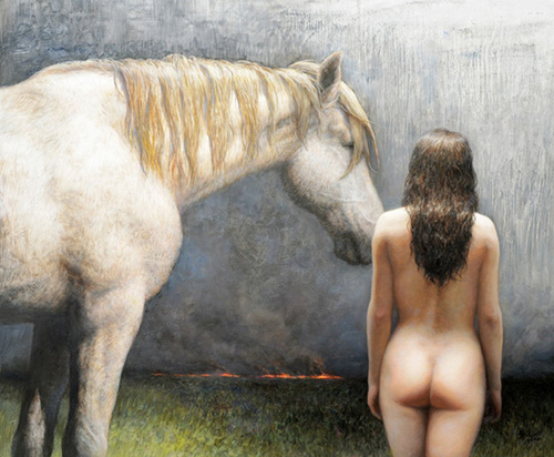 暗夜——《女人與馬》系列 UNDER THE NIGHT, WOMAN AND HORSE 趙大陸 《暗夜》 2008年作 布面油畫 100cm×120cm 2008年畫家在澳大利亞旅居期間常到牧場采風(fēng),作為藝術(shù)家亦是愛馬之人,細(xì)膩的人馬關(guān)系、人與自然的和諧皆帶給他無限靈感,進(jìn)而創(chuàng)作了《女人與馬》這一系列的作品。莊子所說“天地與我并生,而萬物與我為一”,正是畫家通過作品試圖傳遞的思想。 在這幅作品中,我們無法觀察到女人的表情,或許她正注視著遠(yuǎn)方燃燒的地平線,或許她正凝視著馬兒的雙眸;她的背影隱約透露出一絲憂慮,而身邊的白馬正溫柔地向她探過頭去。從構(gòu)圖來看,人的表現(xiàn)力更強(qiáng),馬匹的著色和筆觸則悄然令它融于背景之中。畫家用象征性的手法描述人類與馬匹的精神交流,而通常認(rèn)為的人處主動、支配的地位似乎正被畫面的比重所顛覆——人與動物均是自然界中的一個元素,同樣會對不確定的未來產(chǎn)生危機(jī)感。人與馬作為前置的主體結(jié)合到灰暗的天空與草地中,唯一的亮色卻來自遠(yuǎn)方令人擔(dān)憂火焰,柔和的人體和粗狂的馬同樣訴說著對自然的眷戀和熱愛,并在這樣的環(huán)境中相互慰藉著。 |