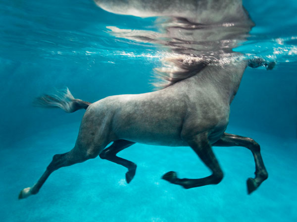 Vanessa von Zitzewitz 的攝影事業(yè)起步于1991 年, 當(dāng)她剛從位于法國巴黎的帕森設(shè)計(jì)學(xué)院畢業(yè)后不久,這位德國攝影師就很快獲得了巨大的成功。她的作品細(xì)致入微,品質(zhì)較高,贏得了許多諸如Cartier、Graff 和Boucheron 等奢侈品牌的青睞, 也曾為CarlaBruni、Mick Jagger、Luciano Pavarotti 和Monica Bellucci 等名人拍過照片。 她擁有一身在陽光下曬過的小麥色皮膚,一頭淡黃色的濃密頭發(fā),炯炯有神的雙眸,精通多國語言,做事雷厲風(fēng)行且富有魅力,Vanessa無疑是一位綻放在上流社會的漂亮女人。然而,她卻曾像法國圣西爾軍校學(xué)生一樣在布列塔尼荊棘叢生的荒野中艱難地長途行軍。她還曾以人道主義者的身份游歷世界,通過拍攝作品,至今仍在救助300多名曼谷的孤兒。因其付出的努力,2008 年,她受到聯(lián)合國教科文組織的頒獎。 11 歲時,Vanessa 就迷戀上了騎馬,開始參加馬術(shù)比賽。但是直到2010 年,她才開始用相機(jī)記錄有關(guān)馬的一切。承蒙卡塔爾埃米爾Sheikh Hamad bin Khalifa Al-Thani 及其女兒兼伊斯蘭藝術(shù)博物館館長的恩準(zhǔn),Vanessa 得以有幸前往Al Shaqab 農(nóng)場的馬廄拍攝優(yōu)良的純種阿拉伯馬。十九世紀(jì),卡塔爾人在Al Shaqab 這個地方打敗了土耳其人并脫離了奧斯曼帝國的統(tǒng)治,該農(nóng)場是為了紀(jì)念這場重大戰(zhàn)役而得名。Vanessa 應(yīng)邀拍攝了《卡塔爾的馬——Al Shaqab農(nóng)場的傳奇》這一作品集。 作為阿拉伯社會不可或缺的組成部分,阿拉伯馬不僅是優(yōu)雅和權(quán)勢活生生的體現(xiàn),還象征著文化、財(cái)富。在卡塔爾,馬匹的繁育和訓(xùn)練已然不僅是一門科學(xué),也是一門藝術(shù)。按著Vanessa 的話說,她是在參觀Al Shaqab 農(nóng)場時愛上了阿拉伯的馬:“它們與場地障礙的參賽運(yùn)動馬太不一樣了,訓(xùn)練它們不是為了騎,就是為了欣賞美,有時,它們精致美好, 宛若波斯人小巧精致的藝術(shù)品?!?作品集記錄了農(nóng)場上多彩的生活狀態(tài),照片中既有給馬匹喂食、梳理、釘蹄等日常照料的畫面,也記錄了馬在沙漠中飛馳、馬駒出生等令人難忘的時刻。 鏡頭下,這些日常生活中的場景被幻化成了如詩如畫的美景。像馬匹在水中訓(xùn)練這樣平常的事情也被升華為一件藝術(shù)品,成為吸引人們注意的重要作品之一。為了捕捉到馬兒在水中雕刻般俊美的“舞姿”,Vanessa戴著相機(jī)在碧藍(lán)的泳池中屏氣潛水,這才造就了圖中這幅蔚為壯觀的(在小皇宮美術(shù)館的展品規(guī)格為4 米×5 米)攝影作品。9 幅作品的組合,讓觀者情不自禁地產(chǎn)生一種伴著馬匹一同“游走”在水中的感覺。 Vanessa 無不驚喜地說:“當(dāng)我在水中和馬兒們一起訓(xùn)練的時候,我感覺自己處于一種空前的和諧氣氛中,地面上的喧鬧似乎在瞬間便被收容進(jìn)了一個密封的瓶子中,我就像眼前水中漫步的這匹馬Alzeer 一樣,擁抱著難得的靜謐悠閑。”溫暖而綺麗的陽光透過水層撲面而來,光與影在瓦藍(lán)的水中融匯在一起,深深淺淺的有很多種不同的藍(lán)色,交匯成了一股令人嘆為觀止的力量,美得極具魅力。四周安靜,又充滿生氣,她和馬兒都享受著如同飛翔一般的自由和快樂。人、馬和周圍的一切相融共生,就好像彼此從沒分開過。 |