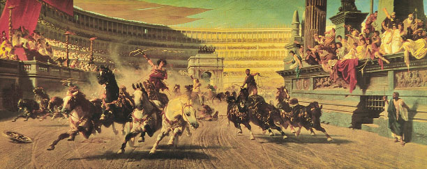 亞歷山大·馮·瓦格納(1838 - 1919 年) 《羅馬的馬車比賽》1882 年左右布面油畫 138.2×347 cm 曼徹斯特,曼徹斯特美術(shù)館 長期以來,羅馬都有為贏得重大軍事勝利的將領(lǐng)舉行凱旋游行的傳統(tǒng)。為了更有效地炫耀戰(zhàn)功、威懾對手、籠絡(luò)下層,龐培和愷撒等人將凱旋游行與舞臺節(jié)目、馬車比賽、角斗士對決、人獸搏斗、集體處決、模擬戰(zhàn)斗等項目結(jié)合起來,創(chuàng)造出了一種極其“壯觀”的全民娛樂方式。匈牙利畫家亞歷山大·馮·瓦格納的這幅作品正是描繪了古羅馬這項全民娛樂方式之一的馬車比賽。激烈的比賽場面以迎面領(lǐng)頭的兩駕馬車的生動描繪為亮點,駿馬似乎要躍然紙上。觀者仿如身臨其境,驚嘆駿馬飛馳電掣的速度,感受古羅馬斗獸場的揚塵,聽到兩旁人群的吶喊歡呼,體會古羅馬這項壯觀的對決。羅馬四駕馬車的力學(xué)設(shè)計令人驚嘆,馬車前進只依靠中間的兩匹馬牽引,兩側(cè)的馬只起控制、推動中間兩馬的作用。給兩側(cè)的馬上挽具很講究,要確保這兩匹馬的頭顱可以輕易地與中間的兩匹馬分開。通常情況下,馬車的駕馭人都會將韁繩纏繞在自己的腰間。這種方式非常危險。不過戰(zhàn)爭中也常采用這種方式,因為駕駛者要空出雙手持武器和盾牌。 |