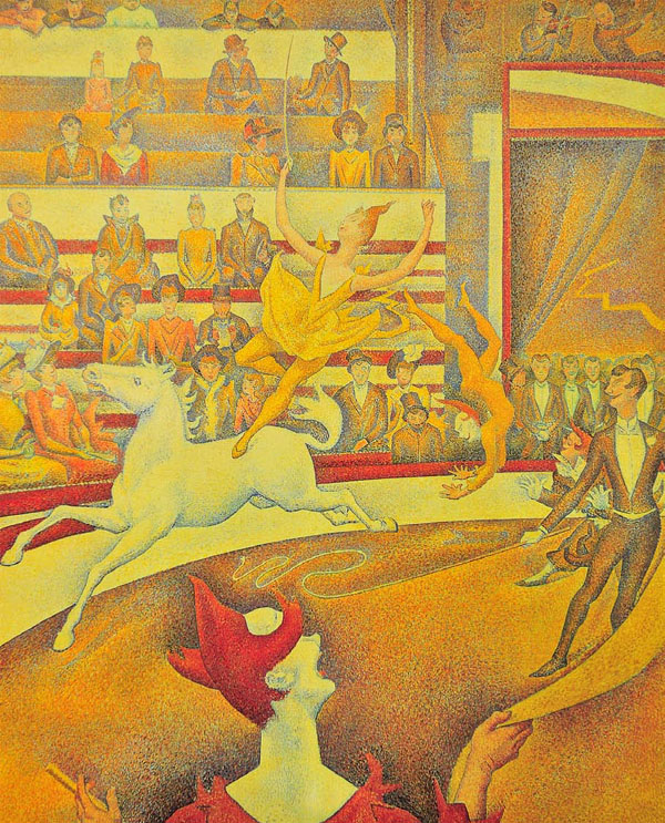 喬治·修拉(1859-1891 年),馬戲團,1891 年,布面油畫,185.5cm×152.5cm,巴黎,奧塞美術館 著名歌舞表演廳紅磨坊的所有人——奧勒和齊德勒購買了圖盧茲·羅特列克的畫作《費爾南多馬戲團》,并將其掛在了走廊。在那兒,喬治·修拉看到了這幅令其贊賞不已的作品。他辭世前所創(chuàng)作的最后一幅偉大作品也描繪了類似的場景,只是縮小了白色駿馬在畫中的比例。這幅作品也從費爾南多巡回演出的馬戲團中獲得過靈感。這個馬戲團是由它的團長——馬術表演家費爾南德·比爾特以自己的名字命名的。 修拉與一些象征派畫家以及美學家查爾斯·亨利之間保持著密切的聯系。在這幅作品中也可以發(fā)現他們各自對修拉的影響。具有諷刺意味的是,自修拉去世后,象征主義者開始回避談論他的作品。 這幅畫作并未完成。畫家去世后,這幅畫在獨立沙龍舉辦的展覽上受到的贊賞也并不多。 |