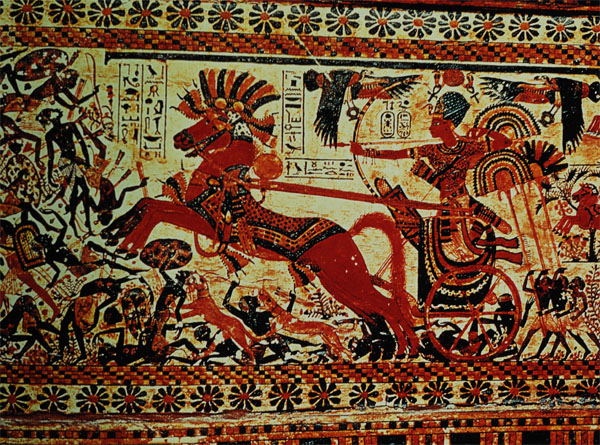 埃及 圖坦卡蒙駕戰(zhàn)車(chē)痛擊非洲人(局部) 公元前1567-1320年左右; 木制,彩繪 ;開(kāi)羅,埃及國(guó)家博物館 這幅描繪年輕的法老王圖坦卡蒙(約公元前1370-1352年)狩獵非洲人的圖畫(huà)與其它幾幅屬于一個(gè)裝飾華麗的木箱表面的裝飾畫(huà)。該木箱是在圖坦卡蒙的墓中發(fā)掘出來(lái)的一件珍寶。發(fā)現(xiàn)時(shí)木箱表面五彩繽紛,色澤鮮亮,雖歷經(jīng)萬(wàn)年仍保存完好,令人驚嘆。 畫(huà)面中,年輕的法老王站在由兩匹充滿力量與激情的駿馬所牽引的戰(zhàn)車(chē)中,一匹栗色露牙,另一匹則是棕色。這兩匹阿拉伯種馬飛奔向前,高高躍起,避開(kāi)跌倒在地的敵人,攻擊狂野有力,與主人勇敢無(wú)畏的脾性相映生輝。而圖坦卡蒙則將韁繩纏繞在自己的腰間,空出兩手張弓瞄準(zhǔn)敵人。 不久前,人們開(kāi)始置疑有關(guān)圖坦卡蒙死于謀殺的說(shuō)法,并提出另一種假設(shè),他有可能是從戰(zhàn)車(chē)上摔下致死。無(wú)論如何,將韁繩纏繞在自己的腰間是一種很危險(xiǎn)的做法,極其容易導(dǎo)致發(fā)生意外。 |