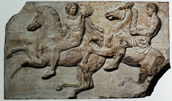 帕特農(nóng)神廟西面的駿馬浮雕【公元前438-432年左右】 大理石,高100 cm ;倫敦,大英博物館 希臘的土壤和氣候不太適合飼養(yǎng)繁殖馬匹。盡管如此,喜愛駿馬的古希臘人仍從波斯人和馬其頓人購買種馬,用以與本地品種雜交。馬匹繁育中心是位于希臘東北部的塞薩利。純種塞薩利馬就是由本地馬匹與東方品種雜交產(chǎn)生的。 現(xiàn)存最早有關(guān)馬的文獻來自一位名叫西蒙的希臘馬師,但其所寫的絕大部分內(nèi)容現(xiàn)已丟失。后來,希臘著名歷史學(xué)家和作家色諾芬(約公元前430-356年)也對此進行了研究記載。色諾芬在其《馬術(shù)》中詳細(xì)描述了一匹體格良好的駿馬該有的樣貌,并為此列舉了30多項馬匹體格合格的標(biāo)準(zhǔn)。 頗有意思地是,色諾芬和西蒙對良駒的特點看法一致。而其后的作品則遵循了他們的規(guī)定。帕特農(nóng)神廟西面的這幅駿馬浮雕上充滿力量的駿馬似乎充分切合色諾芬的描述。盡管雕刻在由沉重的大理石修建的建筑物上,但它們看起來栩栩如生,極其敏捷靈巧并富有端莊典雅之美,與文獻中有關(guān)塞薩利馬的描述如出一轍。 |