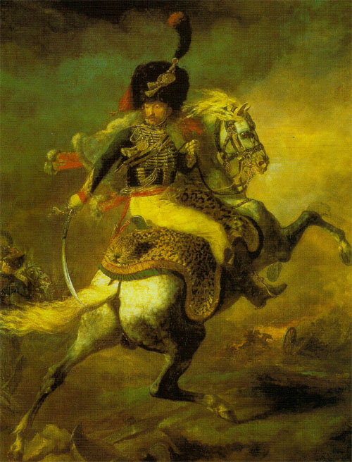 泰奧多爾·席里柯,生于18世紀末19世紀初期,法國浪漫主義天才。他悲劇性的人生既短暫又充滿波折,自幼崇拜馴馬演員,一生與馬緊密相連,畫馬的作品達千幅,年僅33歲卻不幸墜馬身亡。 這幅《輕騎兵軍官》是席里柯早期的成名作,是他在1812年入選沙龍并榮立金獎時的一幅作品,描繪的是一位揮刀馳騁的騎兵軍官躍馬戰(zhàn)場的場景。據(jù)說,畫家是看到后腿直立,前腿躍起的軍馬得到這幅畫的靈感。 在欣賞這幅作品時,首先我們要了解當時的歷史背景。那時法國處在一個動蕩不安的時期,拿破侖發(fā)動的戰(zhàn)爭給人們的生活帶來了巨大變化,并暫時取得了空前的勝利。從騎士騎坐的馬鞍我們就可以看出,豹紋的馬鞍傳達著異國風情的要素,這暗示著拿破侖的勝利已擴大到歐洲大陸以外的地區(qū)。再看馬鐙,青色戰(zhàn)馬狂暴地以后腿站立,騎兵松緩韁繩,腳卻牢牢地蹬住馬鐙,輕松地控制著馬,使人感到人馬合一的最高境界,也暗示著戰(zhàn)爭的空前勝利給人們帶來的歡欣鼓舞。畫面遠處的大炮殘骸則強調了這次沖鋒的激烈和敵人前線已被突破的狀況。面對騎兵的沖鋒,四散奔逃的敵軍發(fā)瘋似的穿過火墻逃亡遠處。畫家在這幅作品中,著力渲染動蕩緊張的氣氛,借助富于張力的躍馬動作、強烈的光影對比、生動的造型、特寫式的拉近場景,使觀眾親臨其境似的感受到硝煙滾滾戰(zhàn)馬嘶嗚的戰(zhàn)場廝殺之中。 從人類躍上馬背,馬從來就不是戰(zhàn)爭的旁觀者,馬的動力驅動著歷史的車輪滾滾向前。相對軍官,畫面中的青色公馬的撼烈無畏更讓人記憶深刻。 |