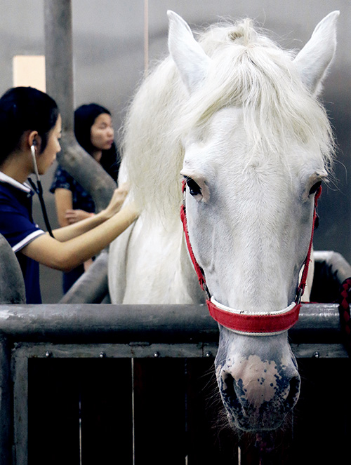 對于廣大愛馬者來說,想必或多或少都了解一些馬匹腹痛的相關(guān)知識。腹痛在馬兒的日常生活中是非常常見的,因為腹腔內(nèi)幾乎所有的器官都能引起馬兒腹痛。而根據(jù)我們俱樂部成年馬的腹痛案例來分析,以大腸阻塞引起的間歇性腹痛最為普遍。 腹痛的風(fēng)險可以降低嗎? 答案是肯定的。這就需要我們對自己的愛馬加強護(hù)理。內(nèi)容主要包括飼喂管理、日常管理、運動管理以及獸醫(yī)的定期護(hù)理(牙科檢查、驅(qū)蟲等),缺一不可。那是不是如果都做到了,我的馬兒就不會腹痛了呢?上述提及的是盡最大的可能去降低腹痛的風(fēng)險,但仍存在很多不可知的因素,比如說運氣不好。 怎么知道我的馬腹痛了呢? 有時候大家是不是會有這樣的疑問,我的馬昨天還好好的能吃能喝,今天怎么就不肯吃東西了?沒錯,腹痛往往就是這么突然的發(fā)生了!當(dāng)然不同品種的馬表現(xiàn)出來的癥狀多多少少是會有差異的,那我們就針對不同品種的馬來舉例說明他們遭受輕度的腹痛時所表現(xiàn)出來的癥狀。一般來說溫血馬對疼痛較敏感,往往會在馬房刨蹄打滾;而弗里斯蘭則相對比較淡定,只會表現(xiàn)出不想吃東西、 臥在馬房不動或是呆呆站著。至此大家應(yīng)該想問 : 那如果我的馬平時不腹痛也喜歡刨刨地打打滾呢?我相信肯定會有這種單一的癥狀出現(xiàn),比如說馬淘氣或者不耐煩都會表現(xiàn)出來刨地的現(xiàn)象,而且剛洗完澡或者剛訓(xùn)練完就會想打個滾兒,聳聳毛舒服下的情況也屢見不鮮。但是如果下面文章提及的這些癥狀同時出現(xiàn)的話就需要你的重視了。在細(xì)說腹痛癥狀之前,先向大家介紹下應(yīng)該了解的一些小知識。 馬的兩個健康小指標(biāo): 呼吸次數(shù) 8-16次/分鐘,脈搏<60次/分鐘。腹痛癥狀細(xì)分為:噘嘴、沒食欲、甩尾巴、刨地、看肚子、踢肚子、臥倒打滾(通常臥倒將四肢抬起,反復(fù)打滾很容易出現(xiàn)挫傷及擦傷)、屢次做出排尿動作(公馬陰莖時常垂出但不排尿)、排便數(shù)量減少、有時候會呈犬坐姿勢、出冷汗等。對于腹痛而言,這些癥狀一般是不會單一出現(xiàn)的。如果說馬出現(xiàn)刨地、踢肚子、反復(fù)打滾的癥狀那大家就應(yīng)該重視了,此刻你們需要立即找獸醫(yī)幫忙。 獸醫(yī)是如何診斷腹痛的? 接下來簡單向大家介紹一下我們馬醫(yī)院獸醫(yī)的檢查順序。首先要對其做臨床的檢查,觀察馬整體的精神狀態(tài)以及用聽診器聽心率和腸音,再看牙齦的顏色及脫水情況。牙齦一般分為白、粉、紫三色(白色代表了缺血或脫水,粉色代表正常,而紫色就代表了疼痛及敗血性休克);而打開嘴巴按壓牙齦觀察毛細(xì)血管再充盈時間則作為馬是否脫水的依據(jù)。當(dāng)然我們馬醫(yī)院還會做一次血常規(guī),通過血液報告來分析此時腹痛的情況,最后會根據(jù)實際需要再看是否做直腸檢查和胃管檢查。 直腸檢查 想必大家會問為什么一定要做直腸檢查?其實這個看似不雅觀的操作對于腹痛診斷是一項非常重要的檢查手段。不過直腸檢查需要專業(yè)獸醫(yī)來操作,因為非專業(yè)人士會有間接造成馬直腸撕裂繼而導(dǎo)致馬死亡的可能。而一個有經(jīng)驗的獸醫(yī)會通過直腸觸診到30%-40% 器官 ( 小腸、骨盆曲、腎臟、盲腸、膀胱 ),從而告訴你腹痛的原因。當(dāng)然馬兒急性腹痛時經(jīng)腹部 B 超檢查也是一種不錯的檢查手段,它能提供很多有用的信息從而對引起腹痛的原因做出更為科學(xué)的判斷。當(dāng)然需要再次強調(diào),這需要有實踐操作經(jīng)驗的獸醫(yī)來完成。因為一個有經(jīng)驗的獸醫(yī)能夠80%~90% 分析出腹痛的原因從而提高診斷的準(zhǔn)確性。 胃管檢查 可能在不熟悉胃管功能的人們眼里,給馬插入胃管相當(dāng)于對其施刑一樣,但是你們知道為什么有必要使用胃管嗎?有兩個主要原因:1、通過胃管導(dǎo)出的胃內(nèi)容物可以作為判斷是什么問題造成腹痛的依據(jù)。2、馬是不會吐的動物,胃內(nèi)容物過滿或氣體過多會有導(dǎo)致胃擴張甚至胃破裂的可能,此時胃管就成為了胃部減壓的唯一途徑。如果說馬心率達(dá)到 60 以上,是非常有必要先倒胃再進(jìn)行灌胃的,因為許多案例是由于胃擴張引起的劇烈腹痛。 腹腔穿刺是否有必要? 對于一般的腹痛案例來講并不一定需要做這項檢查,但如果是疑似器官破裂、扭轉(zhuǎn)之類的問題,腹腔穿刺是非常有必要的。因為通過腹腔穿刺液的指標(biāo)可以判斷腹痛的嚴(yán)重性以及是否還有必要做手術(shù)。一般來說腹腔液先會發(fā)生改變,之后才會在血液檢測中體現(xiàn)。例如腹腔液顏色、透明度的變化(是否有血色、膿液及異物),還可以通過特殊儀器檢查蛋白質(zhì)含量,蛋白質(zhì)含量過高預(yù)示著中毒現(xiàn)象。 簡單介紹下腹腔穿刺的操作方法:較安全的操作方式是取平行于腹中線的最低點,在 B超引導(dǎo)下避開腸管用穿刺針刺入腹腔抽取腹腔液即可。 那么具體應(yīng)該如何治療? 完成上述檢查后,針對馬的腹痛情況獸醫(yī)會選擇性給予止痛藥(正常來講藥效能維持 30分鐘 -6 小時),若馬只是輕度腹痛則一般會通過胃管灌服適量液體和石蠟油(最常見的通腸組合)。對于中度至重度的腹痛,一般來說心率、呼吸的頻率都會加快,如果說馬心率大于 60 次是非常有必