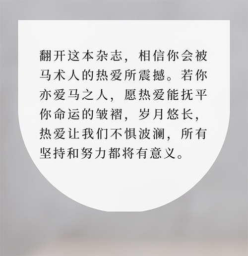 「起步 1982-1998」 內(nèi)蒙古是現(xiàn)代馬術(shù)的起點,40年前,相信傳奇教練張漢文先生,一定也是因為熱愛才會將一生奉獻(xiàn)給了馬術(shù)事業(yè)。從內(nèi)蒙古隊、新疆隊、西藏隊,再到廣州賽馬場,他培養(yǎng)了大量的人才,成為中國馬術(shù)的奠基人。 「創(chuàng)業(yè) 1998-2008」 有張漢文先生作為引路人,此后內(nèi)蒙古隊、新疆隊、西藏隊、廣東隊等省隊,開始了中國馬術(shù)人奮勇向前,不懼困苦的道路。 「發(fā)展 2008-2022」 經(jīng)歷了起步期與創(chuàng)業(yè)期的崢嶸歲月,直至 2008 年,申奧成功的火焰點亮了中國馬術(shù),成為重大的分水嶺,中國馬術(shù)開始向社會化、國際化、市場化轉(zhuǎn)變,隨后吸引了更多新生代愛上馬術(shù)運動,走向職業(yè)化的道路,成為可貴的后備軍。 2006 年,在中國還很難找到與馬相關(guān)的資料,憑著熱愛,《馬術(shù)》雜志創(chuàng)刊。隨著 2022 年這期中國馬術(shù) 40 年紀(jì)念刊的完成,《馬術(shù)》也成為了垂直行業(yè)唯一連續(xù)出版 17 年的雜志。 《中國馬術(shù)40年特刊》的制作周期很長,幾個月的采訪與拍攝,我們找到了多位 80 年代就開始跨上馬背的騎手和從業(yè)者。從少年到古稀,他們一直延續(xù)著馬術(shù)生涯,也是因為熱愛。這些成熟騎手有的依舊活躍在高級別的馬術(shù)賽事中,有的成為教練,或俱樂部經(jīng)營者,推動著行業(yè)的發(fā)展,他們是馬術(shù)運動的寶貴資產(chǎn)。熱愛,不僅是一種生命姿態(tài),更是一種生命能力。 「運動馬」 馬術(shù)運動的精髓是馬與騎手之間的合作。有的騎手在采訪期間談到與自己相伴多年的老馬時,甚至潸然落淚。40年的回顧我們也沒有遺漏這些為推動馬術(shù)競技水平作出貢獻(xiàn)的馬,我們梳理出了十匹重要的運動馬,這些擁有著勇敢之心的馬匹,幫助騎手挑戰(zhàn)一個接一個的高度,應(yīng)該被記住和懷念。 「青少年」 中國馬術(shù)還有長路要走,我們的馬匹繁育調(diào)教水平還處于探索初期,我們青少年人才梯隊的建設(shè)布局初見端倪,馬術(shù)俱樂部用地非常不穩(wěn)定,還需政策的支持……而這些都決定著中國馬術(shù)發(fā)展的質(zhì)量,以及能走多快、能走多遠(yuǎn)。 「外籍教練」 中國馬術(shù)40年,其實是個開始。 馬術(shù)運動的發(fā)展首先需要打開眼界去突破認(rèn)知。從 90 年代新疆隊最早出國去吉爾吉斯斯坦訓(xùn)練,帶回了先進的理念,到其他省區(qū)隊紛紛走出國門去訓(xùn)練與交流,再到之后多位外籍教練進入中國,在這個“走出去,請進來”的過程里,國際力量的支持不僅幫助中國訓(xùn)練出優(yōu)秀的馬術(shù)騎手,提高了運動馬的調(diào)教水平,而且對中國馬術(shù)行業(yè)的正確觀念意識起到了引導(dǎo)作用。 |