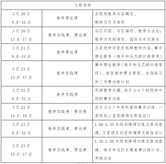 中國馬術(shù)協(xié)會關(guān)于舉辦四星和五星級(高級教練員)培訓(xùn)班的通知 各相關(guān)單位、會員、馬術(shù)愛好者: 馬術(shù)運(yùn)動的發(fā)展離不開優(yōu)秀的教練員、運(yùn)動員做出的貢獻(xiàn)和投入。為了鼓勵馬術(shù)運(yùn)動的傳承,中國馬術(shù)協(xié)會將針對優(yōu)秀的教練員、運(yùn)動員申請教練員技術(shù)等級開辟特殊政策通道,對有對應(yīng)歷史比賽成績和教學(xué)經(jīng)驗(yàn)的教練員、運(yùn)動員進(jìn)行定向培訓(xùn)定星。 為了提升馬術(shù)運(yùn)動教學(xué)和訓(xùn)練水平,根據(jù)中國馬術(shù)協(xié)會教練員培訓(xùn)計劃,馬術(shù)高級教練培訓(xùn)將于2023年3月20日-23日在線下舉辦。本次培訓(xùn)將由經(jīng)驗(yàn)豐富的外教來華授課,進(jìn)一步提升執(zhí)教理論及實(shí)踐水平。培訓(xùn)合格者將對應(yīng)報名條件被授予中國馬術(shù)協(xié)會星級教練員能力水平證書。 現(xiàn)就本次培訓(xùn)相關(guān)事宜通知如下: 一、培訓(xùn)時間、地點(diǎn) (一)時間:2023年3月20日(周一)-23日(周四) (二)地點(diǎn):待定 二、培訓(xùn)內(nèi)容 ※具體日程安排詳見后續(xù)日程安排表,根據(jù)報名人數(shù)可能會有調(diào)整。 三、報名資格要求 (一)5星級: 1.年滿35周歲,身體健康; 2.代表國家隊(duì)參加過奧運(yùn)或亞運(yùn)會的運(yùn)動員,或在國家馬術(shù)隊(duì)任教1屆奧運(yùn)或亞運(yùn)及以上的教練員; 3.執(zhí)教年限在10年以上;帶訓(xùn)學(xué)員中至少有2名獲得國二級騎手等級或1名學(xué)員獲得國一級騎手等級,學(xué)員需要在該名教練帶訓(xùn)期間,獲得相應(yīng)騎手等級。 (二)4星級: 1.年滿30周歲,身體健康; 2.至少獲得過一屆全運(yùn)會馬術(shù)項(xiàng)目決賽前八名成績;或獲得過兩屆及以上全運(yùn)會馬術(shù)項(xiàng)目決賽個人有效成績的運(yùn)動員;或獲得過三屆及以上全國錦標(biāo)賽決賽個人有效成績的運(yùn)動員。 3.執(zhí)教年限在10年以上;帶訓(xùn)學(xué)員中至少有2名學(xué)員獲得中一級騎手等級或1名學(xué)員獲得國三級騎手等級。 四、報名事項(xiàng) (一)報名時間:自即日起至2023年2月20日12:00前報名并提交審核材料于報名專用郵箱,逾期報名無效。 (二)報名資料:報名表電子版,一寸白底照片2張及電子版,身份證復(fù)印件,有效成績或身份證明復(fù)印件。 (三)報名方式:將報名表、一寸白底照片電子版等文件打包發(fā)送至報名郵箱?,F(xiàn)場報道時需提供2張一寸白底照片(背面寫姓名)、身份證復(fù)印件、有效成績或身份證明復(fù)印件。 報名郵箱:liu.ying@ceatpo.com (四)報名確認(rèn):學(xué)員報名即需提交審核材料,確認(rèn)后請于截止日期前繳納報名費(fèi),最終以報名確認(rèn)信息或報名確認(rèn)郵件為準(zhǔn)。 (五)退課:課程準(zhǔn)備工作按報名人數(shù)進(jìn)行,因此報名一旦確認(rèn)即產(chǎn)生費(fèi)用。開課前15天及以上,可退款50%;開課前7天以上,不足15天,可退款25%;開課前7天內(nèi)(包含7天),不予退款。 (六)報名、咨詢聯(lián)系人:劉穎 聯(lián)系電話:18612650507 微信號:liu18612650507 郵箱:liu.ying@ceatpo.com (七)收費(fèi)標(biāo)準(zhǔn):鼓勵為馬術(shù)運(yùn)動競技水平提高做過貢獻(xiàn)的教練員,僅本次報名費(fèi)用優(yōu)惠20%。 4星級:原價12000元/人,優(yōu)惠后為9600元/人 5星級:原價13500元/人,優(yōu)惠后為10800元/人 (八)付款方式:銀行轉(zhuǎn)賬 匯款銀行:北京銀行天壇支行 匯款賬戶名:北京中聯(lián)金馬體育發(fā)展有限公司 賬號:20000045341600037064420 ※備注:1.【4或5星級教練員- 姓名 - 所繳費(fèi)用】 2.匯款截圖或退款通知單請拍照截圖發(fā)送至報名郵箱:liu.ying@ceatpo.com 3.交通食宿費(fèi)用自理 (九)如遇不可抗力因素(政府行為、戰(zhàn)爭、自然災(zāi)害、疫情問題等)造成學(xué)員的損失,中國馬術(shù)協(xié)會根據(jù)不同情況酌情處理。 附件: 培訓(xùn)報名表(四星) 培訓(xùn)報名表(五星) 中國馬術(shù)協(xié)會 2023年2月3日 掃碼可獲取附件 |