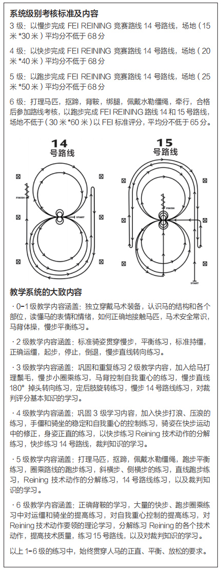 據(jù)《馬術(shù)》雜志 2018 年 7 月份的數(shù)據(jù)統(tǒng)計(jì),全國(guó) 1802 家馬術(shù)俱樂(lè)部中開(kāi)展西部馬術(shù)教學(xué)的馬術(shù)俱樂(lè)部占比為 9%,也就是 162家。國(guó)內(nèi)最大的西部馬術(shù)運(yùn)動(dòng)協(xié)會(huì)——中馬國(guó)際西部馬術(shù)促進(jìn)會(huì)(簡(jiǎn)稱西促會(huì),英文縮寫(xiě) ZWU)近年來(lái)將青少年馬術(shù)培訓(xùn)列為重點(diǎn)項(xiàng)目,致力于國(guó)內(nèi)青少年馬術(shù)教學(xué)的傳播與實(shí)踐,目前在國(guó)內(nèi)已成立 17 家青少年培訓(xùn)基地。2018 年在巴西舉辦的“WBHA 世界青少年馬術(shù)繞桶世界杯”中,西促會(huì)選派的中國(guó)隊(duì)獲得團(tuán)體季軍,陳若溪更是勇奪中國(guó)首個(gè)世界繞桶馬術(shù)冠軍。 近年來(lái)西促會(huì)每年都會(huì)在山東、北京、江蘇舉辦 4-5 場(chǎng)“青少年馬術(shù)邀請(qǐng)賽”,另外“青少年西部牧場(chǎng)工作”也是其最具代表性的賽事。該賽事極具觀賞性,對(duì)促進(jìn)青少年對(duì)馬術(shù)的理解和技能進(jìn)階都有較大幫助。 2018 年,無(wú)疆牧場(chǎng)美國(guó)夸特馬協(xié)會(huì)(簡(jiǎn)稱 AQHA)中國(guó)分會(huì)全面推出 AQHA 中國(guó)青少年西部馬術(shù)比賽體系,并且獲得了北京市馬術(shù)運(yùn)動(dòng)協(xié)會(huì)的認(rèn)證,采納北京馬術(shù)協(xié)會(huì)青少年西部馬術(shù)賽事標(biāo)準(zhǔn)。該體系分為兩大類(lèi)四個(gè)項(xiàng)目:地面類(lèi) - 牽行展示賽、騎行類(lèi) - 西部騎行賽、西部馭馬術(shù)初級(jí)賽、西部馭馬術(shù)中級(jí)賽。(詳細(xì)信息可見(jiàn)北京市馬術(shù)運(yùn)動(dòng)協(xié)會(huì)官網(wǎng)) Reining(雷寧)馬術(shù)作為國(guó)際馬術(shù)聯(lián)合會(huì)的馬術(shù)競(jìng)技項(xiàng)目,自2016年起,由TOUCH牧場(chǎng)馬術(shù)俱樂(lè)部率先從美國(guó)國(guó)家Reining馬協(xié)會(huì)(簡(jiǎn)稱 NRHA)引入技術(shù)資源。3年來(lái),TOUCH牧場(chǎng)通過(guò)其持續(xù)不斷地舉辦培訓(xùn)和賽事,總結(jié)實(shí)踐經(jīng)驗(yàn),并聽(tīng)取多方意見(jiàn),結(jié)合FEI的教學(xué)體系以及針對(duì)青少年的競(jìng)技要求,總結(jié)出了一套更加適合國(guó)內(nèi)Reining馬術(shù)現(xiàn)狀的青少年Reining馬術(shù)教學(xué)系統(tǒng)。2019年5月4日,首屆由中國(guó)馬術(shù)協(xié)會(huì)主辦的“2019年TOUCH-開(kāi)拓者杯中國(guó)馬術(shù)協(xié)會(huì)REINING系列賽”正式打響,該賽事的成功正是對(duì)這一教學(xué)系統(tǒng)可行性的有力驗(yàn)證。 青少年 Reining 馬術(shù)教學(xué)體系 TOUCH青少年Reining馬術(shù)教學(xué)系統(tǒng),是一套以推廣為目的的教材,為讓孩子從零基礎(chǔ)的小白開(kāi)始,到能熟練地操控馬匹完成 Reining 的各個(gè)技術(shù)動(dòng)作,達(dá)到可以完成國(guó)際賽事的水平。該系統(tǒng)分為教學(xué)系統(tǒng)和考核系統(tǒng)兩大部分。 考核系統(tǒng)涵蓋各個(gè)級(jí)別的測(cè)試考核內(nèi)容和評(píng)分標(biāo)準(zhǔn)。同時(shí)系統(tǒng)分4個(gè)年齡段,分別為:4-6歲,6-8歲,8-12歲,12-16歲年齡組別。4-6歲的學(xué)員可通過(guò)1-2級(jí)的考核,6-8歲的學(xué)員可通過(guò)1-4級(jí)的考核,8-12歲可通過(guò)1-5級(jí)的考核,12-16歲的學(xué)員可通過(guò)1-6級(jí)考核。每個(gè)級(jí)別有相對(duì)應(yīng)的評(píng)分標(biāo)準(zhǔn),其中3級(jí)、4級(jí)、5級(jí)、6級(jí)可通過(guò)“通級(jí)賽”,第6級(jí)別的考核是按照FEI國(guó)際馬聯(lián)裁判標(biāo)準(zhǔn)執(zhí)行,平均分不低于65分為達(dá)標(biāo)。 教學(xué)系統(tǒng)的內(nèi)容圍繞考核系統(tǒng)而進(jìn)行,分6個(gè)學(xué)習(xí)階段,每個(gè)階段代表一個(gè)級(jí)別,學(xué)員從0級(jí)開(kāi)始學(xué)習(xí),通過(guò)“通級(jí)測(cè)試考核”或者“通級(jí)測(cè)試賽”來(lái)決定是否可進(jìn)入下一個(gè)級(jí)別的學(xué)習(xí)(不可越級(jí))。 美國(guó)青少年西部馬術(shù)概況 主要協(xié)會(huì) 全美小牛仔西部競(jìng)技協(xié)會(huì)(National Little Britches Rodeo Association,簡(jiǎn)稱 NLBRA),成立于 1952 年,是世界上最古老的青少年西部馬術(shù)競(jìng)技協(xié)會(huì)之一。參賽的小牛仔年齡從 5-18 歲不等,大致分為三個(gè)年齡組別,設(shè)有不同難度等級(jí)的項(xiàng)目。很多小牛仔的職業(yè)牛仔競(jìng)技之路都從這里開(kāi)始。協(xié)會(huì)每年在全美 33 個(gè)州舉行 500 余場(chǎng)青少年牛仔競(jìng)技巡回賽,每年有近 3000 名小牛仔參與其中。巡回賽中積分多的小牛仔有機(jī)會(huì)參加 7 月在俄克拉荷馬州舉行的總決賽。2018 年的全美小牛仔西部競(jìng)技總決賽共吸引了 1144 人參賽,分出獎(jiǎng)金共計(jì) 380,000 美金。 全美繞桶馬協(xié)會(huì)(National Barrel Horse Association,簡(jiǎn)稱 NBHA),是世界上最大的繞桶馬協(xié)會(huì),成立于1992 年。每年舉辦數(shù)百場(chǎng)青少年繞桶馬術(shù)比賽,在每年 7月的最后一周會(huì)舉辦世界青少年繞桶馬術(shù)冠軍賽。 美國(guó)青少年夸特馬協(xié)會(huì)(American Quarter Horse Youth Association,簡(jiǎn)稱 AQHYA),隸屬美國(guó)夸特馬協(xié)會(huì)(AQHA),是全世界最大的針對(duì)特定品種馬的青少年協(xié)會(huì)。AQHYA 的項(xiàng)目種