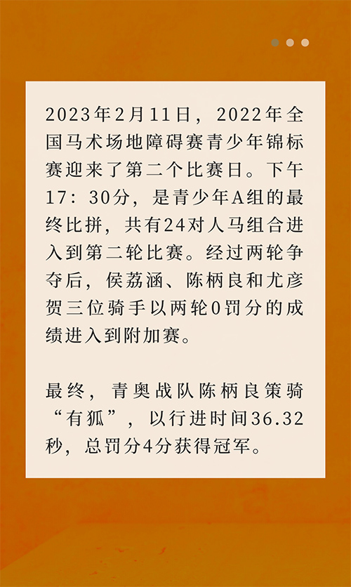 侯荔涵策騎馬匹“Lucky青”,以附加賽4罰分,行進(jìn)時間40.03秒的成績獲得亞軍,尤彥賀策騎馬匹“紀(jì)梵?!?,以附加賽8罰分,行進(jìn)時間42.08秒的成績獲得季軍。 賽后,青奧戰(zhàn)隊陳柄良接受了《馬術(shù)》雜志的采訪。此次他一共帶了兩匹馬前來比賽,其中,合作一年半的馬匹“有狐”在此次比賽中與他配合突出,并最終取得了好成績。陳柄良在跟另一匹馬“大明大放”的配合過程中出了些失誤,但是他很快振作精神,再次與“有狐”搭檔登上了賽場,在與“有狐”的配合過程中,他全程的表現(xiàn)很鎮(zhèn)定,在“有狐”的幫助下拿到了此次比賽的冠軍。 “‘有狐’是一匹很聰明的馬,他會思考他的騎手每個動作的含義,努力去配合騎手的動作習(xí)慣,可以說他是我的半個老師。我之前看過很多大騎手的采訪,他們一生中都會有幾匹讓他們受益匪淺的馬,對我來說,在這個階段,‘有狐’就是那匹馬?!?/div> 陳柄良今年21歲,在參加青少年錦標(biāo)賽的騎手中年齡較大,這也意味著,對他來講,能參加全國青少年錦標(biāo)賽的機(jī)會也越來越少了?!拔耶?dāng)時在想,這可能是我能參加的最后一場青少年錦標(biāo)賽了,我一定要全力以赴不留遺憾?!彪m然競爭對手也都實力強(qiáng)勁,但陳柄良依舊頂住了壓力?!皦毫Υ蟠_實會緊張,會發(fā)揮失常。但當(dāng)壓力大到一個頂點(diǎn)之后,就無所謂了。而且我之前參加過幾屆青少年錦標(biāo)賽,都多多少少留有遺憾,這一次,我的最終目標(biāo)就是不留遺憾地完成整個比賽?!?/div> 目前,正在北京讀大學(xué)的陳柄良,把未來的側(cè)重點(diǎn)放在了馬術(shù)上?!拔业亩唐谀繕?biāo)是希望自己在學(xué)業(yè)完成之前,成為一名能獨(dú)當(dāng)一面的馬術(shù)騎手,能不依賴教練和父母,而獨(dú)立訓(xùn)練、參賽。長期目標(biāo)是將來從事馬術(shù)行業(yè),能夠活躍在賽場上,并且成為一名優(yōu)秀的馬術(shù)教練。” 陳柄良的教練王鵬皓分享了青奧戰(zhàn)隊的訓(xùn)練經(jīng)驗。他表示:“我們的團(tuán)隊在去年12月就做了今年2月的比賽規(guī)劃,以賽代練讓騎手們早早地進(jìn)入比賽的狀態(tài)。在1月份我們打了2022超級馬術(shù)俱樂部聯(lián)賽總決賽 & 2023天星調(diào)良馬術(shù)賀歲杯,過年的時間讓馬休息后,轉(zhuǎn)過年,青奧戰(zhàn)隊就來到了長三角全明星鳥巢之路南北爭霸賽的賽場,經(jīng)過一系列爭奪,我們獲得了全明星鳥巢之路南北爭霸賽的冠軍。就這樣,帶著一個良好的競技狀態(tài),我們的團(tuán)隊來參加了全國場地障礙賽青少年錦標(biāo)賽?!?/div> “在6年前,青奧戰(zhàn)隊組建的時候,那時候我們整個團(tuán)隊就僅有我和Vajk教練兩人。但那時,我們的信念很堅定。我們可以輸,但絕不會放棄。就這樣6年走了過來,我們的團(tuán)隊漸漸壯大,有了很多年輕的血液,雖然我們的團(tuán)隊還有很大的提升空間,但這幾年來,我們已經(jīng)從一個默默無聞的團(tuán)隊,逐漸被人們看見,被人們提及。” 圖/依米大麥 文/門景鈺 |