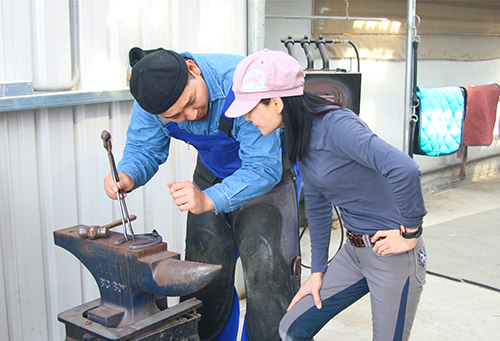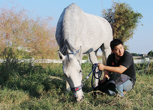 他,透過雙手雙眼,細(xì)膩表達(dá)著深邃敏感的內(nèi)心…… 在生命的悸動(dòng)里,熟悉硬冷的蹄鐵,將熱情灌注塑型。在生活的軌跡上,自我定位,注入新能量。在無畏的旅途中,標(biāo)記了百煉千錘的夢(mèng)想! 藍(lán)友謙,一個(gè)從小在馬場(chǎng)翻滾的小孩兒,總是自由自在地在馬房前來回蹓跶……恣意地與馬對(duì)談交心!由于父親是馬場(chǎng)經(jīng)營(yíng)者,又是資深教練,藍(lán)友謙比任何人更有理由學(xué)習(xí)馬術(shù)。但是,年幼的他,卻不喜歡騎馬,他不愿意見到馬匹身上套著韁繩、備著馬鞍、有著任何裝備,甚至不喜歡見到有人騎乘,他喜愛馬匹原本的純凈,沒有束縛的模樣。 由于沒有學(xué)習(xí)馬術(shù)的興趣,藍(lán)友謙剛上國(guó)中時(shí),嚴(yán)格的父親試圖為他找出發(fā)揮體能的有益運(yùn)動(dòng),將他送往了中國(guó)臺(tái)東的棒球隊(duì),開啟他的棒球生涯。直到高中畢業(yè),當(dāng)時(shí) 17 歲的他,只身前往日本,繼續(xù)大學(xué)的學(xué)業(yè)。第一年上了語(yǔ)言學(xué)校,由父母提供學(xué)費(fèi),進(jìn)入大學(xué)之后,所有學(xué)費(fèi)及生活費(fèi)用,全部得靠自己打工賺取。藍(lán)友謙輕輕地說著:“當(dāng)時(shí),我住在寄宿家庭,一邊上課一邊工作,靠著自己打工,賺取零用錢,維持生計(jì)以及支付所有學(xué)雜費(fèi)用,連周六、周日也沒有固定的休息時(shí)間?!?nbsp; 大學(xué)畢業(yè)后,藍(lán)友謙和同齡人一樣奔波于各大單位的面試中,漸漸發(fā)覺朝九晚五的生活并不是自己想要的。此時(shí)他的腦海中不禁開始思考著,對(duì)于“馬”自己始終還是最無法忘情的?!拔耶?dāng)時(shí)的想法是能夠接觸馬,長(zhǎng)久地跟馬在一起,那么除了‘騎馬’做個(gè)騎手之外,跟馬有關(guān)的就是釘掌修蹄。”他說。因此,在 25 歲時(shí)(一般都是 10幾歲開始學(xué)習(xí)釘蹄),藍(lán)友謙不顧大家反對(duì),進(jìn)入日本裝蹄協(xié)會(huì)裝蹄教育中心。 “在日本學(xué)習(xí)釘蹄,跟自己想象中的還是有落差的?!彼硎?,由于校方嚴(yán)格的規(guī)定,每個(gè)人每天上午 6 點(diǎn)必需開始清理馬房,依照馬房前黑板上標(biāo)注馬匹的草料份量來喂馬。每周六每位學(xué)生必須騎馬,主要為的是了解馬匹在行進(jìn)間的動(dòng)態(tài),注意馬匹四肢的伸展以及馬匹全身的重心分布。下馬后,刷洗馬匹,將馬安置回馬房。 在學(xué)習(xí)過程中,因?yàn)槎际浅鯇W(xué)者,怕傷了活馬,所以,學(xué)校是使用死蹄(馬尸體截取下來的馬腳)分發(fā)給學(xué)生一人一只,每一只死蹄都有一個(gè)編號(hào),學(xué)生必需自行保管。平時(shí)置于冰箱冷凍,上課時(shí)得事先從冰箱取出退冰,通常是上午取出退冰,下午上課教學(xué)用,上完課再包裝好放回冰箱。藍(lán)友謙說:“上課時(shí),大家手上都拿著一支馬腳,想象著跟一匹活生生的馬一起工作,真是很特別的經(jīng)驗(yàn)!” 在后期,學(xué)生們必須要了解馬腳的內(nèi)部結(jié)構(gòu),因此要上解剖課。去除馬皮后解剖,以便了解馬腳內(nèi)肌腱的牽引、肌肉的生長(zhǎng),認(rèn)識(shí)第一節(jié)骨、第二節(jié)骨以及蹄內(nèi)神經(jīng)的位置等,最后還要組合成完整形體,制成馬腳標(biāo)本。 在這個(gè)日本的裝蹄教育中心的老師也是出了名的嚴(yán)格!打蹄鐵有幾項(xiàng)要求,基本標(biāo)準(zhǔn)是:1. 在規(guī)定的時(shí)間內(nèi),把原本馬蹄形的蹄鐵,打成一根直挺挺的鐵條,寬、窄、厚、薄必需相等,兩端必須成 1 公分見方的正方形。2. 把蹄鐵打成數(shù)字形狀,0、1、2、3、4、5、6、7、8、9,線條要求平順,不能走樣。3. 一般考試的標(biāo)準(zhǔn)為:以 4 號(hào)蹄鐵為標(biāo)準(zhǔn)規(guī)格,從原本的一根鐵條敲打成馬蹄形的蹄鐵(前腳蹄鐵的鐵條長(zhǎng)度為 28 公分,后腳蹄鐵的鐵條長(zhǎng)度為 27 公分)。通常在 25 分鐘內(nèi)必需完成一個(gè)前腳蹄鐵及后腳蹄鐵。但日籍老師要求學(xué)生在 15 分鐘內(nèi)就必需完成。4. 在學(xué)習(xí)打蹄鐵時(shí),所使用的火爐必須學(xué)習(xí)使用傳統(tǒng)古法,即“焦炭火爐”來打鐵。由學(xué)生們自己燒煤炭生火,借助鼓風(fēng)機(jī)送風(fēng)讓火的溫度更高,由于高溫下的蹄鐵很容易就被烤熔,所以也讓學(xué)生們學(xué)習(xí)控制打鐵時(shí)的火力及速度。藍(lán)友謙微笑著介紹,據(jù)說當(dāng)時(shí)他們這群學(xué)生是歷屆以來煤炭使用量最多的。因?yàn)槊總€(gè)人上課都非常認(rèn)真,都想把握機(jī)會(huì)學(xué)習(xí)……此起彼伏的敲擊聲,熱鬧得很哩! 在學(xué)校練習(xí)打蹄鐵的工廠(教室)前方 ,有一個(gè)專門設(shè)置的特殊步道,形似狗骨頭, 兩端為圓形場(chǎng)地,連接兩端圓形場(chǎng)地的是 10 幾公尺長(zhǎng)度的長(zhǎng)形步道,在步道前方另設(shè)有一個(gè)長(zhǎng)方形的凹槽地道,放置一個(gè)往下的階梯。這個(gè)特殊作用是:學(xué)生釘掌前及完成釘掌后,一人牽著馬匹來回在步道行走,另一人則進(jìn)入凹槽地道沿著階梯上下,眼睛的高度剛好跟步道的高度平行,可以去觀察正在行走的馬匹的腳底部修蹄是否完善?釘?shù)奶汨F是否合適?借著馬匹來回直走及繞著圓形場(chǎng)地走的方向,可以觀察到不同的角度。 另外,值得一提的是在北海道,有一個(gè)全日本最大的賽馬