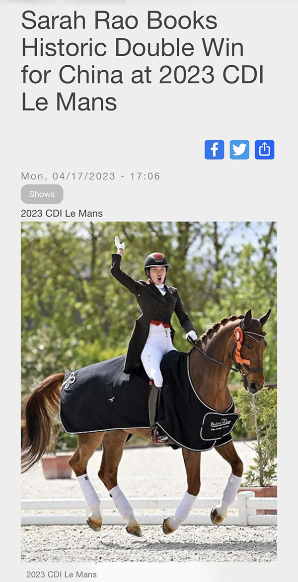中國盛裝舞步騎手饒嘉怡自2018年開始征戰(zhàn)國際盛裝舞步賽以來,首次在國際盛裝舞步賽中奪冠。2023年4月14日至16日,在法國勒芒的國際馬聯(lián)國際盛裝舞步賽中,中國騎手饒嘉怡在圣喬治級別和第一中級音樂自由演繹的比賽中各贏得了一個冠軍,取得了巨大的勝利!國際專業(yè)馬術(shù)媒體Eurodressage評論道:“這是中國國歌首次在國際盛裝舞步賽中奏響?!?/div> 在這場比賽中,饒嘉怡搭檔“柯基(Alfranco)”首次在四星級大獎賽中獲得了67.196%的得分(巴黎奧運會MER的得分要求是67分)。饒嘉怡開心地分享到:“我和“柯基”已經(jīng)拿到一半的巴黎奧運會MER了?!?/div> Eurodressage對饒嘉怡的報道在Eurodressage官網(wǎng)SHOWS欄目的頭版 專注和自信帶來了驚喜 2022年2月10日至13日,饒嘉怡和“柯基”和“泰迪(Faydirmie ZH)”首戰(zhàn)法國勒芒,在激烈比賽中獲得了豐富的經(jīng)驗。2023年4月14日至16日,饒嘉怡重返勒芒,用兩場勝利、四星級大獎賽超67%的得分、四星級音樂自由演繹大獎賽中超71%的得分來證明了自己多年的沉淀和積累。 這次比賽饒嘉怡帶了三匹馬,參加小型巡回賽(Small Tour)的“泰迪”和“木法沙(Geniaal)”,以及大獎賽級別的“柯基”。 饒嘉怡策騎“柯基”參加了法國勒芒四星級大獎賽?Les Garennes 這是持續(xù)三天的、充滿戲劇性的比賽經(jīng)歷。比賽第一天,饒嘉怡和“木法沙”在圣喬治級別憑借70.49%的得分從13對人馬組合中脫穎而出?!霸诘谝惶鞀Z冠之后,第二天因為下雨在賽場中發(fā)生假發(fā)脫落的小意外?!?饒嘉怡分享到這段有趣經(jīng)歷。在這一天,她和“泰迪”以68.873%的得分排名第二。 比賽最后一天是大霧,這對馬影響比較大。饒嘉怡說:“馬對于看得見卻看不清的東西特別怕?!别埣吴囊魳纷杂裳堇[路線設(shè)計導(dǎo)致場地人員提著白板準(zhǔn)備關(guān)上場地的時候,她和“泰迪”繞回了A點的短邊。在看不清近處物體的情況下,“泰迪”被嚇了一大跳。接下來,“泰迪”的心態(tài)始終是一驚一乍的。 好在這對人馬組合配合默契。饒嘉怡搭檔“泰迪”以72.408%的得分取得了第一中級音樂自由演繹比賽的冠軍。饒嘉怡的驚喜溢于言表:“我當(dāng)時完全沒有期待冠軍。知道得冠后,我短暫地懵了一陣?!?/div> 面對賽場之上的插曲,饒嘉怡認(rèn)為是經(jīng)驗幫助了她適應(yīng)變化?!叭绻乔皫啄辏铱赡軙恢?,但這幾年經(jīng)歷過各種出人意料的變化后,我對比賽規(guī)則有了更好地了解,我也有了更多經(jīng)驗。如今,我成為了更加沉穩(wěn)的騎手。保持專注和自信是我第三天重新奪冠的關(guān)鍵?!?/div> 同時,專注和自信也讓饒嘉怡在賽場上更加機動和靈活,“特別是最后一天的音樂自由演繹,在自由的路線和音樂的帶領(lǐng)下,創(chuàng)意思維是讓我在一群騎術(shù)精湛的騎手中脫穎而出的關(guān)鍵!” 饒嘉怡搭檔“柯基”在四星級音樂自由演繹大獎賽中獲得第四名?Les Garennes 當(dāng)然,“柯基”的表現(xiàn)也讓饒嘉怡十分滿意。饒嘉怡非常期待她和“柯基”的下一場大獎賽:“我和“柯基”再在國際馬聯(lián)規(guī)定的三星級以上的大獎賽科目中取得超67%的得分,我們就能獲得巴黎奧運會MER了。” 適合騎手的系統(tǒng)至關(guān)重要 這次比賽的勝利堅定了饒嘉怡的信心。饒嘉怡堅定地說:“通過這次比賽的勝利,我對我的理想更加堅定。這次的勝利證明了,只要通過合適自己的系統(tǒng),亞洲騎手也可以實現(xiàn)跟歐洲騎手同樣的成就,即使我并不生于馬術(shù)世家,即使我并不跟隨世界冠軍訓(xùn)練,即使我沒有世界排名的成熟馬。” 饒嘉怡再一次感謝了她的教練Sarah Higgins,“因為我的教練大Sarah很善良,時刻想著的人是我而非她自己。所以,我才能從一個15歲一個人跑來英國誰都不認(rèn)識的小女孩,變成一個更自信、更成熟、更能擔(dān)得起這份勝利的騎手。這些年,有無數(shù)人建議我去找世界級騎手,我依然選擇留在她身邊。這也許就是一日為師的恩情了?!?/div> 賽后,饒嘉怡和Sarah Higgins擁抱慶祝?Sarah Higgins 這次比賽,Sarah Higgins帶著的是“辛巴”,這匹馬的經(jīng)驗沒有那么豐富。所以,饒嘉怡和Sarah Higgins各自帶著不同的計劃上場。“我以保守拿成績來執(zhí)行計劃,大Sarah以勇敢鍛煉年輕馬來執(zhí)行。在比賽結(jié)束時,雖然我略勝大Sarah,但我們依然為‘辛巴’感到高興?!?饒嘉怡談到比賽第二日第一中級的那場比賽時如是說。 忙碌和充實是比賽的主旋律 國際的比賽日非常不同,所有的騎手都在相互關(guān)注著周圍。為期3天的比賽不僅是3天,而是包含到達和驗馬持續(xù)5天的大考驗。這需要饒嘉怡和團隊成員的精神高度集中。 饒嘉怡回憶道:“這一次,我從早到晚幾乎沒有什么時間想別的事情?!笔兹帐讨渭墑e的比賽,饒嘉怡因為在早晨比賽開場和中午比賽壓軸要策騎兩匹馬,所以上午沒有一絲空閑。領(lǐng)獎完畢,吃過午飯之后,饒嘉怡得準(zhǔn)備帶著“柯基”去4星級大獎賽的驗馬現(xiàn)場,隨后準(zhǔn)備上馬訓(xùn)練。晚間的時間留給視頻剪輯和比賽匯報,最后才能在睡覺前做一些自己的事情。中間有零碎時間基本都用來回顧比賽和睡覺恢復(fù)精力了。 饒嘉怡攜“木法沙”在驗馬中?Les Garennes 第三天,因為大獎賽的開賽,饒嘉怡一天之內(nèi)需要比3場國際比賽。事后因為獲得了一半的奧運MER,饒嘉怡