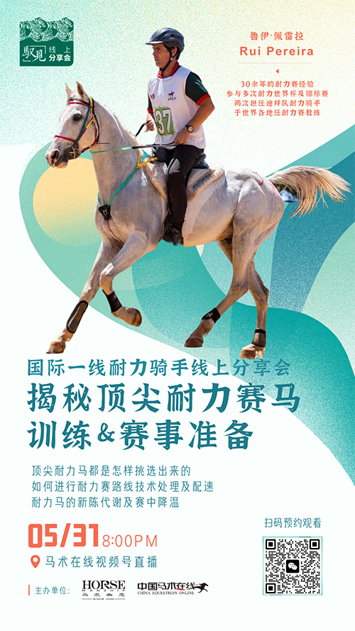 活動信息 時間:2023年5月31日 晚8:00 主題:揭秘頂尖耐力賽馬訓練&賽事準備——國際一線耐力騎手線上分享會 分享平臺:馬術(shù)在線視頻號 活動介紹 耐力賽的受眾相對廣泛,除了專業(yè)的耐力賽騎手外,熱愛休閑騎乘的愛好者可以參與,業(yè)余的騎手可以參與,一些馬主,只要對馬術(shù)騎乘有熱愛,都可以參與其中,是很多馬術(shù)愛好者們喜愛的項目之一。 此次,《馬術(shù)》雜志邀請了來自葡萄牙的一線耐力賽騎手,Rui Pereira,為我們講解如何挑選頂尖耐力馬、如何進行耐力路線技術(shù)處理&配速、馬匹的新陳代謝與賽中降溫、如何在三個月內(nèi)準備耐力賽事、耐力賽馬檢驗的相關(guān)知識、賽后的馬匹維護以及耐力賽團隊協(xié)作等相關(guān)專業(yè)知識。 嘉賓簡介 魯伊·佩雷拉(Rui Pereira),今年46歲。主業(yè)是一位農(nóng)學工程師,擁有園藝公司,同時他還經(jīng)營農(nóng)場,種植蔬菜并繁育耐力馬。魯伊5歲開始騎馬,于1991年第一次參加耐力賽,有30余年的耐力賽經(jīng)驗。 曾在2002年、2003年擔任迪拜隊的耐力騎手,更曾代表葡萄牙參與過多次耐力賽世界杯和世界錦標賽。 致力于幫助不同國家的騎手們獲取世界杯及錦標賽參賽資格。曾任納米比亞、阿根廷、烏拉圭、哥倫比亞、科威特、埃及及南阿拉比亞和中國的耐力賽教練。 活動時間表 2023年5月31日 19:55 直播間開放 20:00 嘉賓演講:如何三個月備戰(zhàn)耐力賽事 20:20 嘉賓演講:耐力馬的新陳代謝及賽中降溫 20:40 嘉賓演講:頂尖耐力賽馬是如何挑選出來的 21:00 直播結(jié)束 一線耐力騎手的干貨分享,快掃描下方二維碼報名! 任何耐力賽相關(guān)問題,歡迎大家在評論區(qū)留言~ |