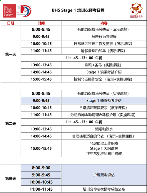 英國馬會BHS(The British Horse Society,簡稱BHS)將于8月25日(周五)舉辦2023年第5場BHS考試。往期許多青少年騎手因?qū)W業(yè)與考試不能兼顧遺憾無法參加考試,應(yīng)他們的強(qiáng)烈要求,今年暑期天星調(diào)良馬術(shù)將開展以青少年騎手為主的BHS培訓(xùn)&考試,由BHS國際中國考官執(zhí)行,達(dá)到考試要求的考生將獲得BHS資格認(rèn)證。在此之前,為保障考生可以順利參加考試,天星調(diào)良馬術(shù)將于8月22日—24日開啟線下培訓(xùn)+預(yù)考評估。 BHS國際 2023年會員新權(quán)益 1、線下&線上培訓(xùn)95折;邀請朋友參加均享受95折。 2、每年免費(fèi)參加2次專題講座。 3、購買《全新馬術(shù)國際通用教程》初階&二階享受88折。 4、贈(zèng)送BHS對應(yīng)級別學(xué)習(xí)&考試中英文大綱。 5、贈(zèng)送參加線下培訓(xùn)&考試期間的保險(xiǎn)。 6、贈(zèng)送印BHS國際LOGO的帽子和T恤。 BHS 預(yù)考說明 為了協(xié)助全球考生更好地準(zhǔn)備BHS各個(gè)階段考試,BHS為考生特別設(shè)計(jì)了預(yù)考(Skills Record,技能記錄),考生通過對應(yīng)階段的預(yù)考后,可報(bào)名BHS考試??荚噲?bào)名時(shí),考生須提交由BHS資質(zhì)認(rèn)證的教練(BHS資格至少比所簽署的資格高一個(gè)級別)簽字認(rèn)可證明。 BHS培訓(xùn)報(bào)名 一、BHS Stage 1 培訓(xùn)+預(yù)考時(shí)間: 8月22日(周二)—24日(周四) 二、培訓(xùn)地點(diǎn): 天星調(diào)良國際馬術(shù)俱樂部 三、培訓(xùn)日程: 注:培訓(xùn)日程僅供參考,可能會根據(jù)報(bào)名人數(shù)進(jìn)行調(diào)整。請以培訓(xùn)當(dāng)天實(shí)際提供的日程為準(zhǔn)。 四、培訓(xùn)&預(yù)考:3480元/人 (不包含交通&食宿,如需要可咨詢工作人員) 關(guān)于BHS體系 英國馬會 BHS,成立于 1947 年,起源于英國,其國際馬業(yè)機(jī)構(gòu)認(rèn)證體系和國際馬術(shù)人才商業(yè)培訓(xùn)認(rèn)證體系為國際馬術(shù)權(quán)威教育&職業(yè)標(biāo)準(zhǔn),早已被多個(gè)國家及地區(qū)的頂級馬業(yè)機(jī)構(gòu)所采用。由BHS體系認(rèn)證的馬術(shù)教練在世界范圍內(nèi)受到權(quán)威認(rèn)可,與全球 28 個(gè)國家馬術(shù)資質(zhì)通行。 在馬房管理、馬術(shù)騎乘、馬術(shù)教學(xué)等職業(yè)發(fā)展的道路上,BHS體系就工作人員職責(zé)與角色、青少年安全監(jiān)護(hù)、馬匹日常護(hù)理、馬匹保健、鞍具保養(yǎng)與安全檢查、放牧場管理、馬匹調(diào)教、騎乘、馬術(shù)教學(xué)、裝備場地維護(hù)等方面,均提出了細(xì)致、嚴(yán)謹(jǐn)?shù)慕鉀Q方案,適合不同年齡段的馬術(shù)愛好者,馬行業(yè)在職人員(馬房管理人員,馬術(shù)教練,馬術(shù)中心管理層等),以及未來希望投身于馬行業(yè)的人員學(xué)習(xí)。 適合人群 0基礎(chǔ)——國際級 1、從青少年到成人(13周歲及以上均可報(bào)名) 2、從業(yè)余馬術(shù)愛好者到馬主 3、從馬房助理到國際馬房經(jīng)理 4、從馬術(shù)教練到奧運(yùn)級教練 5、馬術(shù)商業(yè)機(jī)構(gòu)技術(shù)管理層、馬房一線工作人員、客戶服務(wù)相關(guān)工作人員 ①青少年報(bào)名 BHS Stage 1 (第一階段)考試,是BHS專為業(yè)余馬術(shù)愛好者設(shè)計(jì)的,達(dá)到13周歲即可報(bào)名參加,考試內(nèi)容適合初學(xué)者馬術(shù)入門。對馬匹行為、健康、人馬安全&福利、馬匹管理等建立全方位的理論與實(shí)操基礎(chǔ)。同時(shí)打好馬術(shù)騎乘的基本功,為未來深入系統(tǒng)學(xué)習(xí)馬術(shù)做準(zhǔn)備。廣受各國13周歲及以上的青少年馬術(shù)愛好者歡迎,階段性檢驗(yàn)學(xué)習(xí)成果,為之后的馬術(shù)道路打好基礎(chǔ)。 ②馬行業(yè)工作人員報(bào)名 BHS體系清晰的國際馬術(shù)職業(yè)晉升通道,為馬業(yè)從業(yè)人員的職業(yè)規(guī)劃和晉升給出清晰的發(fā)展方向,系統(tǒng)學(xué)習(xí)專業(yè)技能。從行業(yè)入門開始,在學(xué)習(xí)的每一步提供指導(dǎo)、建議和支持。無論你是想與馬匹工作,還是更傾向于在辦公室工作,BHS體系馬術(shù)教育課程,可以助力你找到更適合自己的職業(yè)發(fā)展。 Why you need BHS資格證書(國際通行) *國際通行~國外馬術(shù)工作 *整合全方位馬術(shù)能力 *教學(xué)內(nèi)容更豐富 *課程結(jié)構(gòu)更清晰 *快速馬術(shù)職業(yè)晉升通道 *助力馬業(yè)機(jī)構(gòu)運(yùn)營管理 *高效專業(yè)工作表現(xiàn) *更高行業(yè)起點(diǎn)薪資 BHS 晉升通道 BHS國際資格證書(國際通行) 作為國際馬術(shù)權(quán)威教育&職業(yè)標(biāo)準(zhǔn)的英國馬會BHS(British Horse Society,簡稱BHS,與全球28個(gè)國家馬術(shù)資質(zhì)通行)體系,此名單查詢系統(tǒng)為馬術(shù)商業(yè)機(jī)構(gòu)提供國際職業(yè)資格證書(國際通行)實(shí)時(shí)查詢。 報(bào)考須知 【BHS Stage 1 考試時(shí)間】 8月25日(周五) 【考試費(fèi)用】 BHS會員年費(fèi):840元 BHS Stage 1 Care: 2100元 BHS Stage 1 Ride: 2100元 【報(bào)名要求】 年齡13周歲及以上 【考試地點(diǎn)】 天星調(diào)良馬術(shù) (北京朝陽區(qū)崔各莊鄉(xiāng)順白路91號) 【注意事項(xiàng)】 1. 所有考生報(bào)名時(shí)必須提交身份證復(fù)印件和意外保險(xiǎn)保單,如沒有意外保險(xiǎn),請聯(lián)系天星調(diào)良馬術(shù)工作人員購買; 2. 