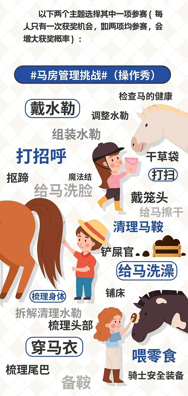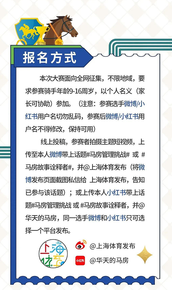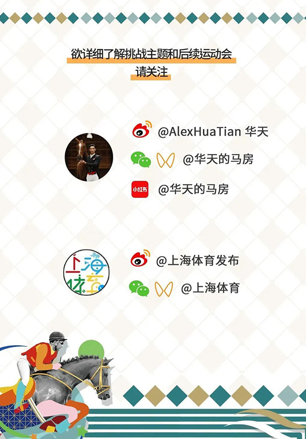 鐺鐺鐺! 馬蹄鐵已敲響! 來(lái)吧! 你的馬房管理挑戰(zhàn)大賽 正式開啟! 跟隨小體來(lái)一探究竟! “小騎手總動(dòng)員”招募令 本次大賽面向全網(wǎng)征集,請(qǐng)仔細(xì)閱讀圖文中內(nèi)容、拍攝“馬房管理挑戰(zhàn)”主題視頻或“馬房故事詮釋者”主題視頻參與活動(dòng),大家在獲得參賽證書的同時(shí),還有機(jī)會(huì)繼續(xù)晉級(jí),參與線下組織的“小騎手總動(dòng)員”運(yùn)動(dòng)會(huì),并最終獲得與華天面對(duì)面交流的機(jī)會(huì)。大賽正式開始,我們等你來(lái)挑戰(zhàn)! 在上海市體育局、上海市慈善基金會(huì)和上海市體育發(fā)展基金會(huì)體育文化專項(xiàng)基金的鼎力支持下,“華天·人馬一心”馬術(shù)教育公益項(xiàng)目將繼續(xù)在2023年推出一系列線上線下活動(dòng):“馬語(yǔ)學(xué)前班公開課”將為青少年開啟馬術(shù)世界的一扇窗;充滿趣味且干貨滿滿的“華天來(lái)了第二季-基礎(chǔ)騎姿”系列視頻;跟蹤小騎手和他們的馬術(shù)小白兄弟姐妹一天的真人秀“OG與小白”,以及大家都可以一試身手的線上“馬房管理挑戰(zhàn)大賽”,實(shí)力展示馬房管理本領(lǐng),以及本公益項(xiàng)目第二年即將出爐的新活動(dòng)“小騎手總動(dòng)員運(yùn)動(dòng)會(huì)”和“華天見面會(huì)”! 了解以上活動(dòng)詳情,請(qǐng)關(guān)注“上海體育發(fā)布”微博、“上海體育”微信、視頻號(hào)、抖音號(hào),以及“@AlexHuaTian華天”微博、“華天的馬房”微信、視頻號(hào)、小紅書、嗶哩嗶哩等社交媒體。十分期待大家的參與,我們不見不散! (上海體育) |