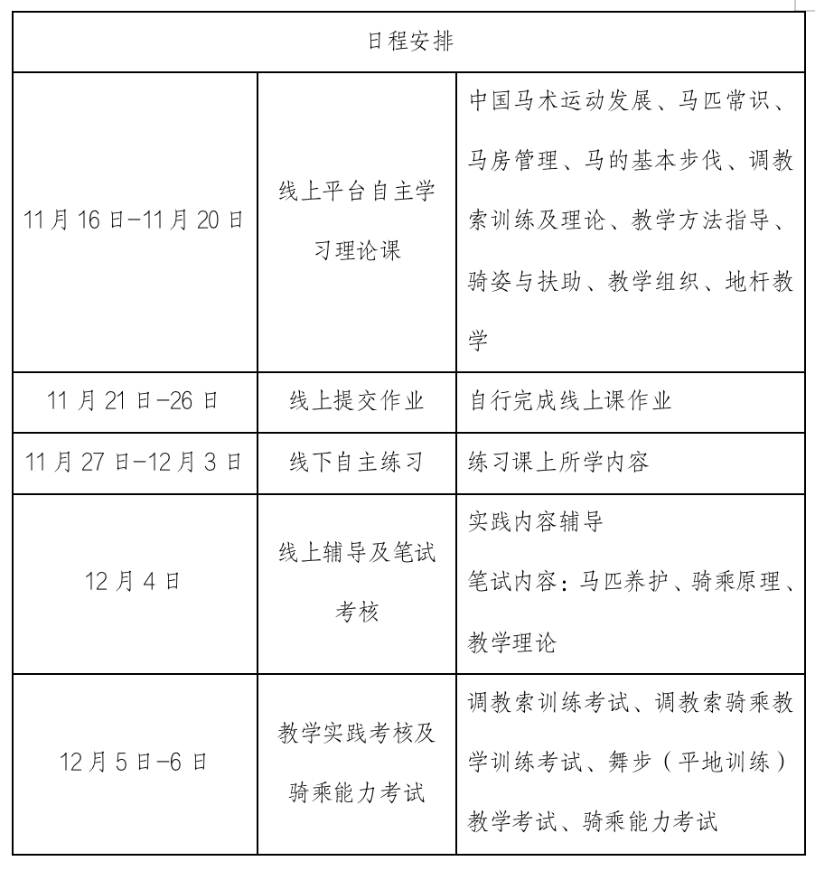 中國馬術(shù)協(xié)會關(guān)于舉辦一星級專業(yè)教練培訓(xùn)考核的通知 各相關(guān)單位、會員、馬術(shù)愛好者: 馬術(shù)一星級專業(yè)教練培訓(xùn)考核將于2023年11月16日-12月6日開班。本次活動以線上、線下結(jié)合方式進行培訓(xùn)與考核,中外專家聯(lián)合授課。考核合格者將被授予中國馬術(shù)一星級專業(yè)教練員能力水平證書,并可進一步申報全國初級教練員崗位班,經(jīng)考試合格后獲取初級職稱。 中國馬術(shù)星級教練體系引入國際權(quán)威騎術(shù)及教學(xué)所需知識技能,由國際國內(nèi)專家聯(lián)合授課。培訓(xùn)借助現(xiàn)代化技術(shù)豐富教學(xué)方式,提供跟蹤輔導(dǎo),提升教練員職業(yè)素養(yǎng)和技能。 現(xiàn)就本次培訓(xùn)考核相關(guān)事宜通知如下: 一、培訓(xùn)考核時間、地點 (一)線上培訓(xùn):2023年11月16日-20日,學(xué)員通過網(wǎng)絡(luò)授課形式,自主登陸參加集中時段的線上學(xué)習(xí)。 (二)線下練習(xí):2023年11月21日-12月3日,學(xué)員自主線下練習(xí)并提交作業(yè)。 (三)線上輔導(dǎo)和實踐考核:2023年12月4日-6日,在線上集中輔導(dǎo)與實踐考核。 二、培訓(xùn)考核內(nèi)容 ※具體日程安排詳見后續(xù)日程安排表,根據(jù)報名人數(shù)可能會有調(diào)整。 三、報名資格要求 (一)年滿18周歲,身體健康; (二)中馬協(xié)中三級及以上級別或具備中三級騎手相應(yīng)能力,培訓(xùn)考核中包含中三級騎乘能力測試; (三)有一年以上的馬術(shù)項目教學(xué)經(jīng)歷; 四、報名事項 (一)報名時間:自即日起至2023年11月13日12:00前報名并提交審核材料于報名專用郵箱,名額數(shù)量有限,報名從速,逾期報名無效。 (二)報名資料:報名表電子版,一寸白底照片電子版,身份證復(fù)印件,馬術(shù)項目騎手等級證書復(fù)印件。 (三)報名方式:將報名表、一寸白底照片電子版、身份證電子版、騎手證電子版等報名資料打包發(fā)送至報名郵箱。 報名郵箱:liu.ying@ceatpo.com (四)報名確認:學(xué)員報名即需提交審核材料,確認后請于截止日期前繳納報名費,最終以報名確認信息或報名確認郵件為準。 (五)退課:課程準備工作按報名人數(shù)進行,因此報名一旦確認即產(chǎn)生費用。開課前15天及以上,可退款50%;開課前7天以上,不足15天,可退款25%;開課前7天內(nèi)(包含7天),不予退款。 (六)報名、咨詢聯(lián)系人:劉穎 聯(lián)系電話:18612650507 微信號:liu18612650507 郵箱:liu.ying@ceatpo.com (七)收費標準:7500元 (八)付款方式:銀行轉(zhuǎn)賬 匯款銀行:北京銀行天壇支行 匯款賬戶名:北京中聯(lián)金馬體育發(fā)展有限公司 賬號:20000045341600037064420 ※備注:1.【一星級教練員- 姓名 - 所繳費用】 2.匯款截圖或退款通知單請拍照截圖發(fā)送至報名郵箱:liu.ying@ceatpo.com (九)如遇不可抗力因素(政府行為、戰(zhàn)爭、自然災(zāi)害、疫情問題等)造成學(xué)員的損失,中國馬術(shù)協(xié)會根據(jù)不同情況酌情處理。 中國馬術(shù)協(xié)會 2023年10月16日 |