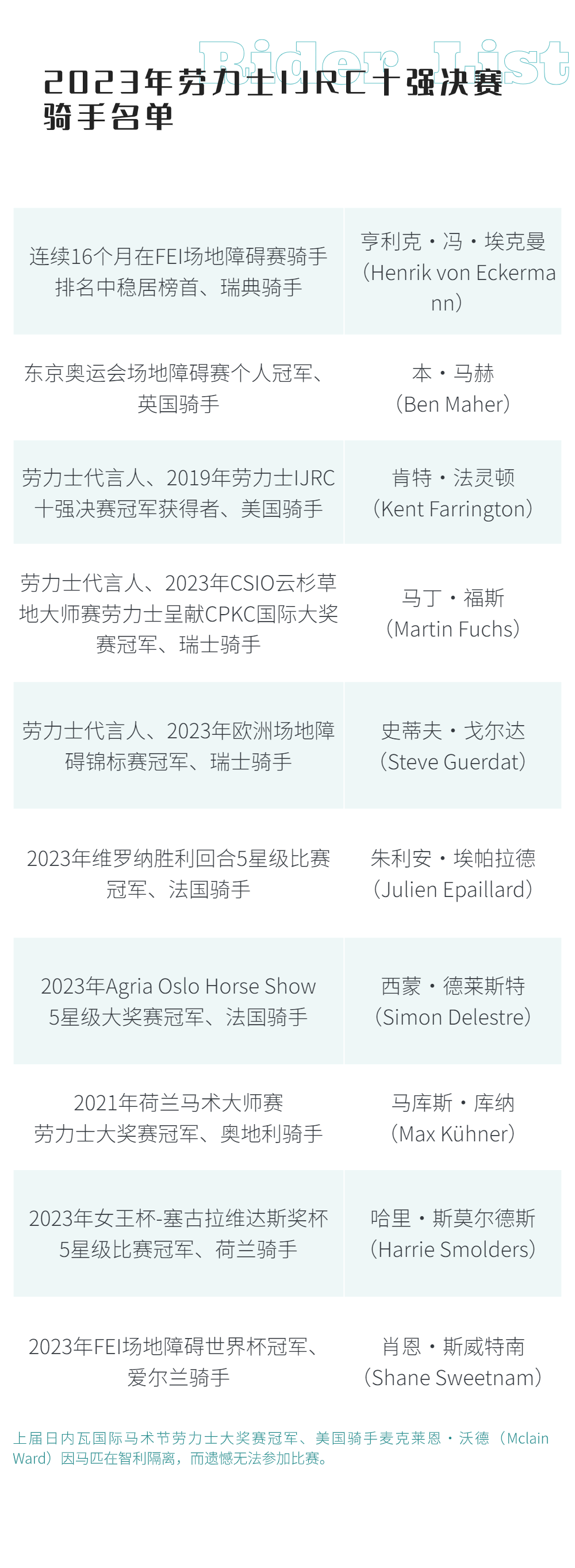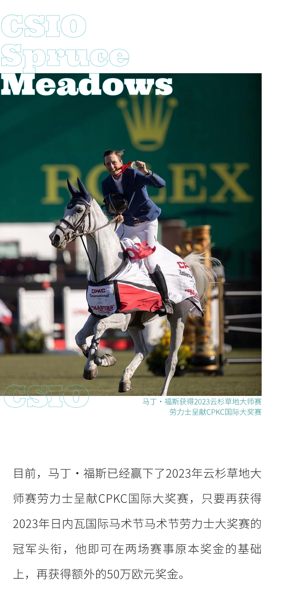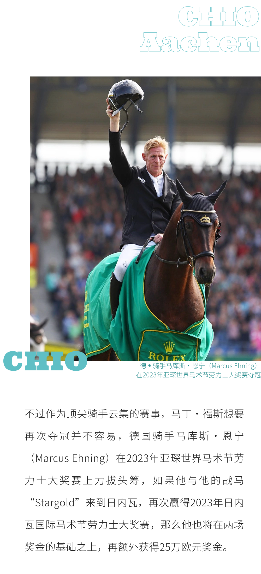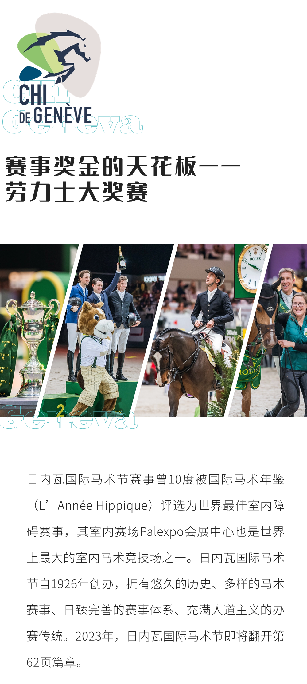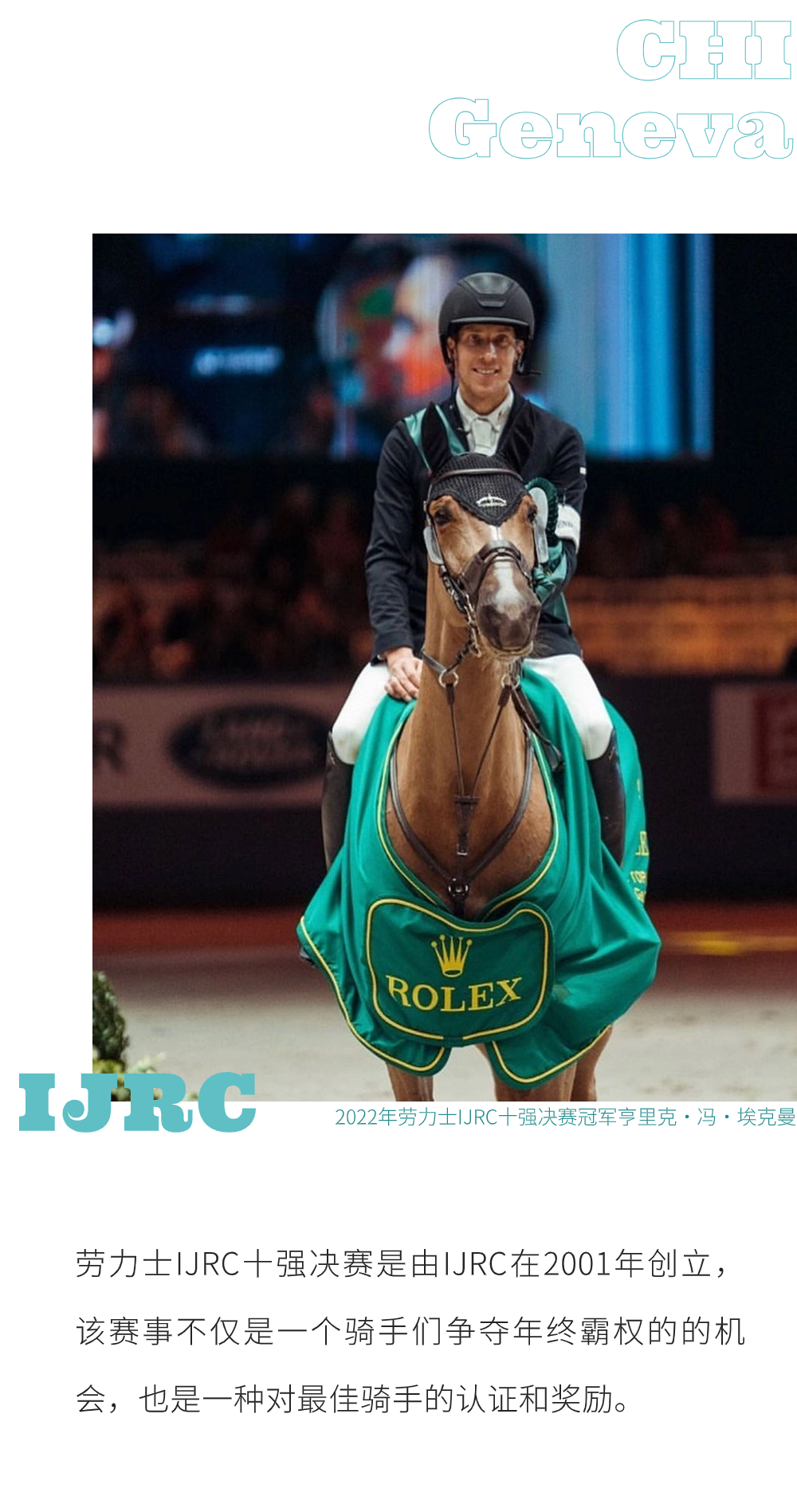 勞力士IJRC十強(qiáng)決賽 地表最強(qiáng)人馬組合 全球唯一由參賽者自行發(fā)起、運(yùn)行的 全年最激動(dòng)人心的賽事之一 日內(nèi)瓦國(guó)際馬術(shù)節(jié) 10次獲評(píng)“世界最佳馬術(shù)室內(nèi)障礙賽” 賽事獎(jiǎng)金的天花板——?jiǎng)诹κ看螵?jiǎng)賽 勞力士IJRC十強(qiáng)決賽、日內(nèi)瓦國(guó)際馬術(shù)節(jié)勞力士大獎(jiǎng)賽直播預(yù)告: 支持單位: 北京市馬術(shù)運(yùn)動(dòng)協(xié)會(huì)、深圳市馬術(shù)協(xié)會(huì)、上海市馬術(shù)協(xié)會(huì) 主辦及版權(quán)引進(jìn): 《馬術(shù)》雜志、馬術(shù)在線(xiàn) 播出時(shí)間: 勞力士IJRC十強(qiáng)決賽將于2023年12月9日晚19:45 - 21:15直播 日內(nèi)瓦國(guó)際馬術(shù)節(jié)勞力士大獎(jiǎng)賽將于12月10日晚21:00-00:30直播 直播平臺(tái): 視頻號(hào)@馬術(shù)在線(xiàn)、抖音@馬術(shù)在線(xiàn)、嗶哩嗶哩APP、咪咕視頻、新浪微博@馬術(shù)雜志及@馬術(shù)在線(xiàn) 服裝及獎(jiǎng)品贊助: 倫德馬服飾、驛樂(lè)馬術(shù) IJRC是國(guó)際公認(rèn)的世界頂級(jí)騎手協(xié)會(huì),代表著FEI以及全球體育機(jī)構(gòu)所有馬術(shù)騎手的利益。據(jù)11月初國(guó)際馬聯(lián)積分排名,參加2023年勞力士IJRC十強(qiáng)決賽的騎手有: 每年,日內(nèi)瓦國(guó)際馬術(shù)節(jié)都是極具人氣的馬術(shù)盛典。作為地表最強(qiáng)人馬組合奮斗一年的決賽,勞力士IJRC十強(qiáng)決賽也是最令觀(guān)眾腎上腺素飆升的精彩賽事,是整個(gè)日內(nèi)瓦國(guó)際馬術(shù)節(jié)賽事中最激動(dòng)人心的賽事之一。 日內(nèi)瓦國(guó)際馬術(shù)節(jié)的馬術(shù)集市 除了壓軸舉行的賽事獎(jiǎng)金的天花板——?jiǎng)诹κ看螵?jiǎng)賽,12月6日-10日期間,日內(nèi)瓦國(guó)際馬術(shù)節(jié)都將舉行各種各樣的賽事及活動(dòng)。 室內(nèi)賽場(chǎng)Palexpo會(huì)展中心 12月9日,日內(nèi)瓦將慶祝勞力士場(chǎng)地障礙賽大滿(mǎn)貫十周年,該活動(dòng)的主角是勞力士代言人、瑞士騎手史蒂夫·戈?duì)栠_(dá)。他是迄今為止,唯一一位十年來(lái)參與過(guò)所有勞力士場(chǎng)地障礙賽大滿(mǎn)貫,共計(jì)34場(chǎng)賽事的騎手。成為世界頂尖的場(chǎng)地障礙騎手,不僅需要天賦、好的馬匹、平靜面對(duì)輸贏(yíng)的心態(tài)、為行業(yè)付出的熱情和奉獻(xiàn)精神,還有重要的兩點(diǎn)就是嚴(yán)于律己的工作態(tài)度和持之以恒的刻苦訓(xùn)練。 ?Rolex/Ashley Neuhof 自2022年12月,《馬術(shù)》雜志和馬術(shù)在線(xiàn)的粉絲們即見(jiàn)證了我們?nèi)諆?nèi)瓦國(guó)際馬術(shù)節(jié)勞力士大獎(jiǎng)賽的直播,經(jīng)歷了荷蘭馬術(shù)大師賽、亞琛世界馬術(shù)節(jié)、云杉草地大師賽,2023年12月,經(jīng)過(guò)一年的輪回,我們?cè)俅斡瓉?lái)2023年日內(nèi)瓦國(guó)際馬術(shù)節(jié)勞力士大獎(jiǎng)賽! 《馬術(shù)》雜志勞力士場(chǎng)地障礙賽大滿(mǎn)貫直播現(xiàn)場(chǎng) 這一年,《馬術(shù)》雜志和馬術(shù)在線(xiàn)在直播中不斷成長(zhǎng),不斷推陳出新,也向觀(guān)眾們展示了我們堅(jiān)定地從紙質(zhì)媒體、網(wǎng)絡(luò)視頻媒體不斷拓展,到現(xiàn)在成為集紙媒、文圖視頻社交媒體、賽事網(wǎng)絡(luò)直播為一體的綜合媒體的決心。 日內(nèi)瓦國(guó)際馬術(shù)節(jié)FEI四輪馬車(chē)世界杯 勞力士IJRC十強(qiáng)決賽、日內(nèi)瓦國(guó)際馬術(shù)節(jié)勞力士大獎(jiǎng)賽直播預(yù)告: 播出時(shí)間: 勞力士IJRC十強(qiáng)決賽將于2023年12月9日晚19:45 - 21:15直播 日內(nèi)瓦國(guó)際馬術(shù)節(jié)勞力士大獎(jiǎng)賽將于12月10日晚21:00-00:30直播 |