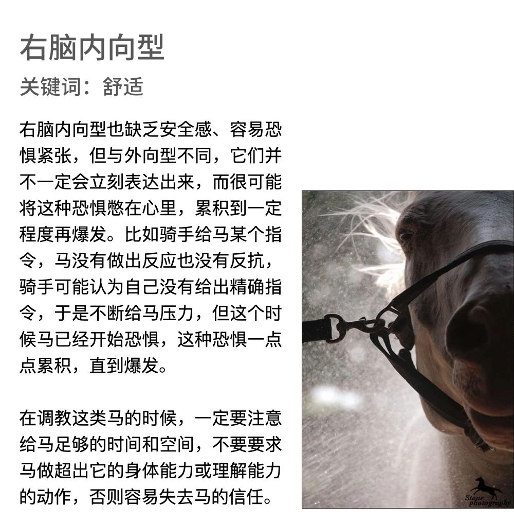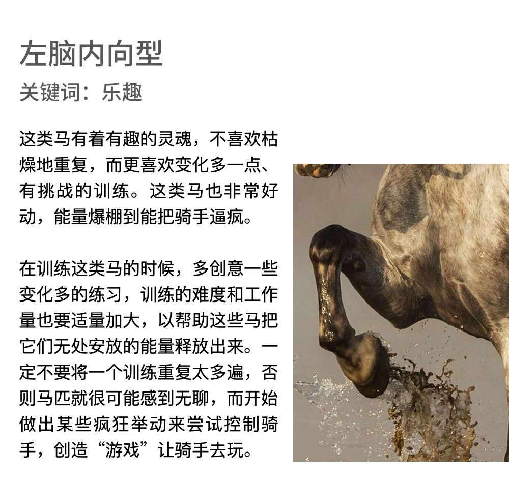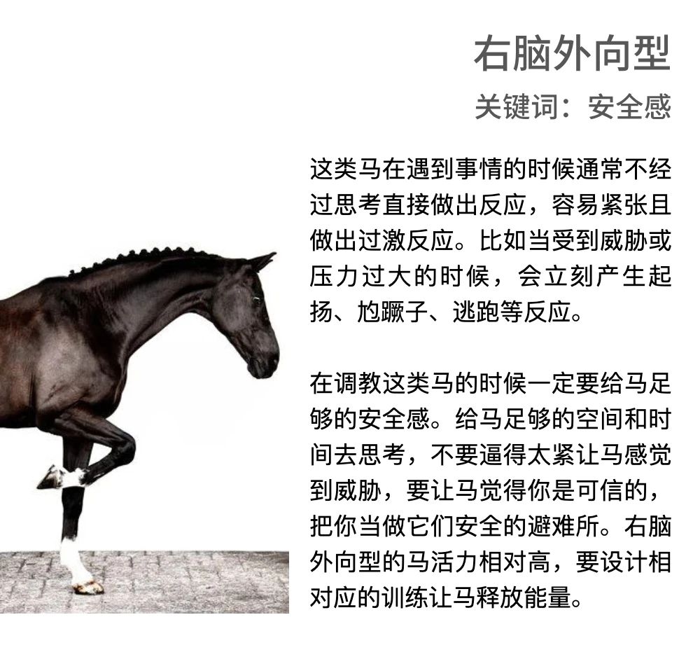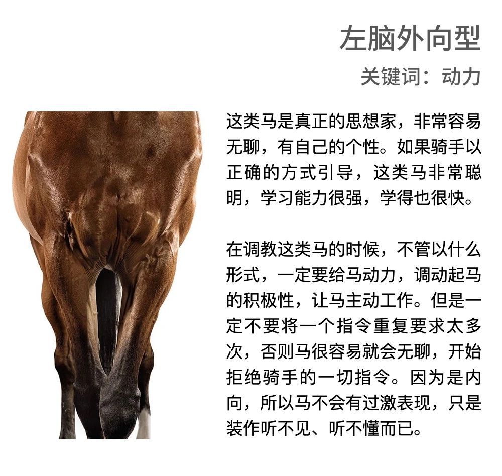 馬兒也有屬于自己的MBTI,對(duì)應(yīng)不同的性格特點(diǎn)和適合的相處模式?!白匀获R術(shù)法”創(chuàng)始人帕特·帕雷利和妻子提出構(gòu)建馬匹性格模型,在美國堪薩斯大學(xué)心理測(cè)量學(xué)專家的獨(dú)立研究下,結(jié)合帕特多年的馬匹相處經(jīng)驗(yàn),將馬分為左腦型內(nèi)向、左腦型外向、右腦型內(nèi)向、右腦型外向,四種不同的性格類別。