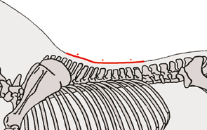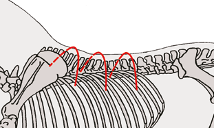 將軟鐵絲放置于馬匹脊柱之上,找到肩甲軟骨的位置,在頂部以2指或3指(約2英寸)的位置將鐵絲的中點(diǎn)放置其上,用粉筆標(biāo)記。而后順馬背形狀向下摁壓軟鐵絲直到其與馬背完全貼合,輕輕拿起,放置在白紙之上,沿鐵絲內(nèi)部勾勒出第一條曲線?;氐今R旁邊,找到粉筆標(biāo)記之后約15厘米(6英寸)的位置為第二個(gè)丈量點(diǎn),重復(fù)這個(gè)步驟,勾勒記錄下第二條曲線。再回到馬身邊,再向后找15厘米,重復(fù)步驟,得到第三條曲線。