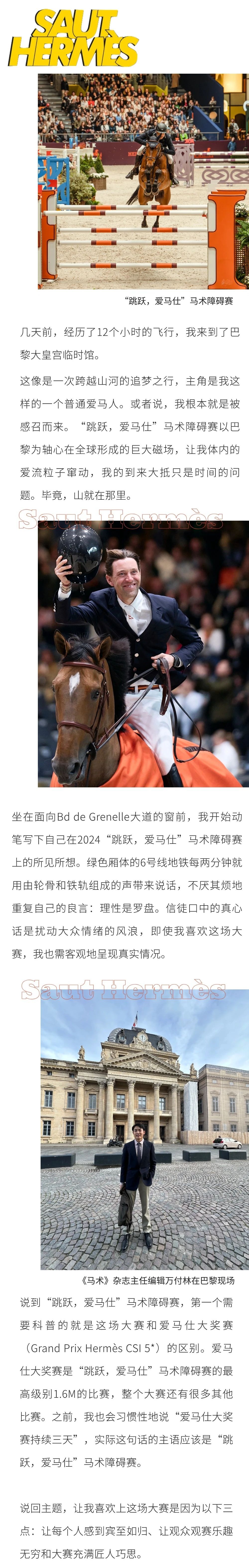 “跳躍,愛馬仕”(Saut Hermès)馬術(shù)障礙賽是一年一度的國際馬術(shù)場地障礙賽,由愛馬仕主辦。今年的“跳躍,愛馬仕”馬術(shù)障礙賽持續(xù)三天(3月15~17日),在巴黎大皇宮臨時館舉辦。 愛馬仕和“跳躍,愛馬仕”馬術(shù)障礙賽的關(guān)系很直接,愛馬仕就是唯一的主辦方。其他的星級比賽,品牌方往往是作為合作方或者贊助商來參與。真正執(zhí)行比賽運營的是賽事公司或協(xié)會。按照這個邏輯,來到比賽的每個人都是愛馬仕的客人。 客人需要的,主人就想在前面。觀眾要看五星級比賽,那就滿足需求。為了達(dá)到五星級的標(biāo)準(zhǔn)和五星級的觀賽體驗,獎金要足額,世界排名的騎手要不遺余力地邀請,場地設(shè)施必須要優(yōu)質(zhì)。 更重要的是,愛馬仕把比賽直接放在了巴黎市中心。以前在巴黎大皇宮里辦,現(xiàn)在大皇宮維修,就放在了巴黎大皇宮臨時館里舉辦。在熱身場,你能看到埃菲爾鐵塔。這對騎手和觀眾來說都太幸福了。 對老巴黎人來說,能把曾經(jīng)在市中心舉辦馬術(shù)比賽的傳統(tǒng)和記憶找回來,沒有比這更美妙的事情了。 大的方面說了,細(xì)節(jié)也得提。除了三排觀眾席,靠近熱身場的主賽場圍欄邊還設(shè)了兩個站立觀賽區(qū)。任何希望離賽場更近的或者覺得座位太靠后的,都可以站在這里看比賽。和你擠在一起的有世界冠軍、馬主、教練、馬工,大家和和氣氣。在這里只要不遮擋其他人觀賽,愛拍攝就拍攝,只有志愿者溫馨提醒你別開閃光。 辦一場大賽,到底是為了什么?耗費資金、協(xié)調(diào)關(guān)系、投入精力,如果最后的結(jié)果和最初的設(shè)想是南轅北轍的關(guān)系,那就太荒謬了。我覺得辦賽第一服務(wù)客群必須是觀眾,官員、贊助商和特邀嘉賓誠然重要。但當(dāng)辦賽人心里只有他們時,這比賽的存續(xù)也就成了難題。在服務(wù)觀眾這一點上,愛馬仕做到了極致。 整個場館動線設(shè)計清晰,標(biāo)識明顯;志愿者會竭力為觀眾提供幫助;紙質(zhì)版的出場順序表于賽前在看臺入口處隨意領(lǐng)??;沒有工作人員驅(qū)趕觀眾和攝影師;餐食提供及時方便……沒人忽視觀眾,更沒人教育觀眾。 比賽好看有兩層含義:第一層是比賽要競爭激烈,要有意思;第二層是比賽要容易看懂。 競爭激烈自不用說,這是比賽的本質(zhì)。尤其是法國觀眾,看到他們引以為傲的西蒙·得萊斯特(Simon Delestre)、法國飛人朱利安·艾佩拉德(Julien Epaillard)、諾曼底驕傲凱文·斯托特(Kevin Staut)和朱利安·安奎廷(Julien Anquetin)被亨瑞克·馮·艾克曼(Henrik von Eckermann)、斯科特·布拉什(Scott Brash)、佩德·德雷弗里克森(Peder Fredricson)和本·馬赫(Ben Maher)這些世界冠軍超越時,扼腕嘆息。強(qiáng)者被強(qiáng)者擊敗,這是全人類都愛看的戲碼。 比賽有意思的程度與路線設(shè)計有關(guān)系。路線設(shè)計師是圣地亞哥·瓦雷拉·烏拉斯雷斯 (Santiago Varela Ullastres) 和格雷戈里·博多 (Grégory Bodo),這兩位是東京奧運會的路線設(shè)計師,也將是今年巴黎奧運會選派的路線設(shè)計師。唯一限制路線設(shè)計師發(fā)揮想象力的僅僅是70×30M的主賽場尺寸和嚴(yán)苛的比賽規(guī)則。在關(guān)注馬匹健康的同時,圣地亞哥直言他設(shè)計的是一條帶陷阱的路線,而且陷阱放在你想象不到的地方。 就比如壓軸的愛馬仕大獎賽,第一輪大部分遭遇障礙罰分的人馬組合在最后一條線路上出現(xiàn)問題:11號紅色雙橫木,落地后3步接12AB。第11道和第12道障礙分布在同一條直線上,而且貼著場地長邊。12接13是一個弧線上的5步。 路線設(shè)計師明顯設(shè)置了顏色陷阱,12AB雙橫木障礙一端為淺藍(lán)色,另一段為深藍(lán)色,其余部分全部為白色。13號單橫木障礙桿全白。白色是馬容易忽略的顏色,所以這三跳都不好完成。同時,12接13的5步弧線走起來很難,整個路線前半程的從容會讓人馬組合放松,但真正的考驗留待路線最后。 第一輪比賽結(jié)束后,從50對人馬組合種篩選出來的9對零罰分完賽的進(jìn)入了附加賽。最后,法國騎手朱利安·安奎廷搭檔“Blood Diamond Du Pont”以附加賽領(lǐng)先朱利安·艾佩拉德和“Donatello D’ auge”0.28秒的完賽成績獲得愛馬仕大獎賽的冠軍。 法國騎手朱利安·安奎廷和“Blood Diamond Du Pont” 比賽容易看懂和賽制有關(guān)系。“跳躍,愛馬仕”馬術(shù)障礙賽三天比賽主要賽制是直觀的一輪爭時賽賽制,既比較障礙罰分,要求騎手掌握好細(xì)節(jié)處理,又要求騎手爭分奪秒。這樣的賽制使觀眾觀看起來非常容易。最高級別的愛馬仕大獎賽用的賽制是一輪比賽加一輪附加賽,畢竟1.6M級別比賽的參賽人馬,誰都想多看他們再跳上一輪驚心動魄的附加賽。 前來觀看比賽的不僅有深諳比賽規(guī)則的馬術(shù)老粉,還有對這項運動充滿探索精神的新人。很多跨界的觀賽者會被邀請參與走路線環(huán)節(jié),愛馬仕會邀請職業(yè)騎手分批帶隊走路線,讓這些對場地障礙運動知之甚少的觀眾能夠看懂比賽,了解職業(yè)騎手需要在這條挑戰(zhàn)重重的路線上做些什么工作,了解路線設(shè)計師和人馬組合之間的博弈是如何展開的。 “跳躍,愛馬仕”馬術(shù)障礙賽為人所稱道的絕不止比賽的精彩程度,還有大賽里里外外透出來的匠心。 顏色是最難操控的元素,但百年品牌調(diào)配起來確是得心應(yīng)手。 