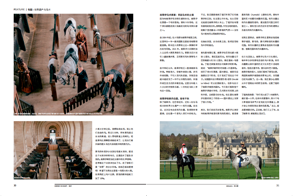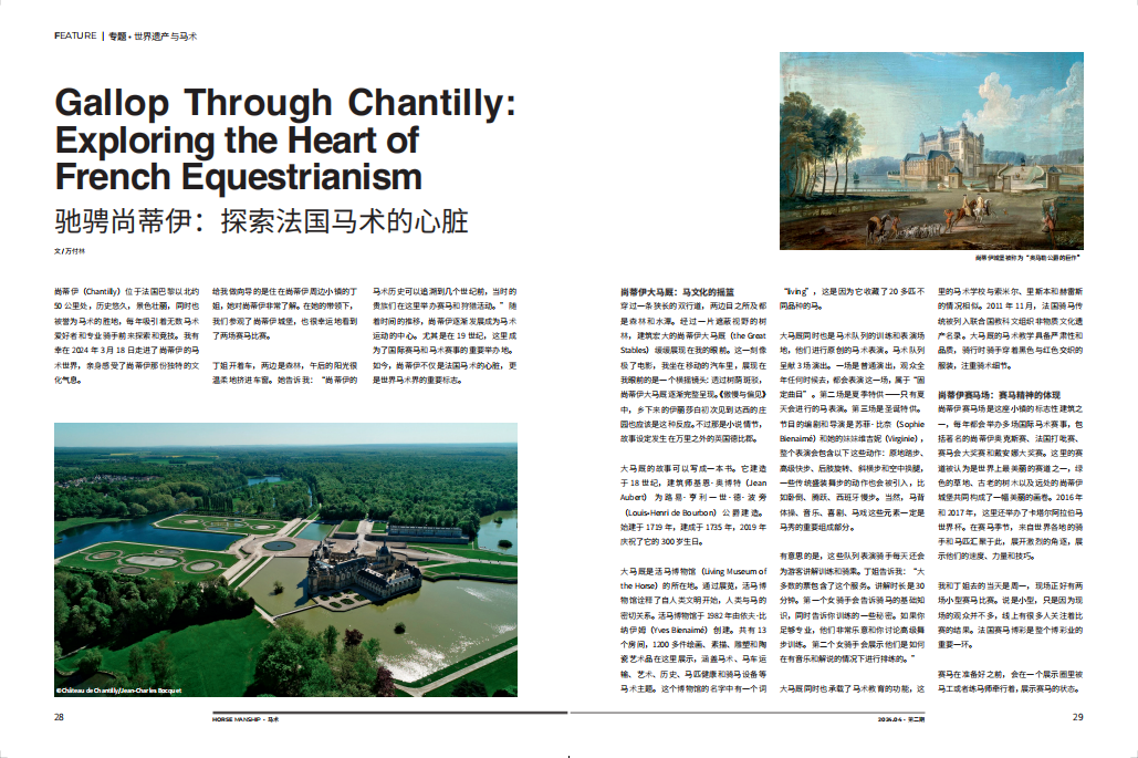 尚蒂伊(Chantilly)位于法國(guó)巴黎以北約50 公里處,歷史悠久,景色壯麗,同時(shí)也被譽(yù)為馬術(shù)的勝地,每年吸引著無數(shù)馬術(shù)愛好者和專業(yè)騎手前來探索和競(jìng)技。隨著時(shí)間的推移,尚蒂伊逐漸發(fā)展成為馬術(shù)運(yùn)動(dòng)的中心。尤其是在 19 世紀(jì),這里成為了國(guó)際賽馬和馬術(shù)賽事的重要舉辦地。如今,尚蒂伊不僅是法國(guó)馬術(shù)的心臟,更是世界馬術(shù)界的重要標(biāo)志。尚蒂伊賽馬場(chǎng)是這座小鎮(zhèn)的標(biāo)志性建筑之一,每年都會(huì)舉辦多場(chǎng)國(guó)際馬術(shù)賽事,包括著名的尚蒂伊奧克斯賽、法國(guó)打吡賽、賽馬會(huì)大獎(jiǎng)賽和戴安娜大獎(jiǎng)賽。