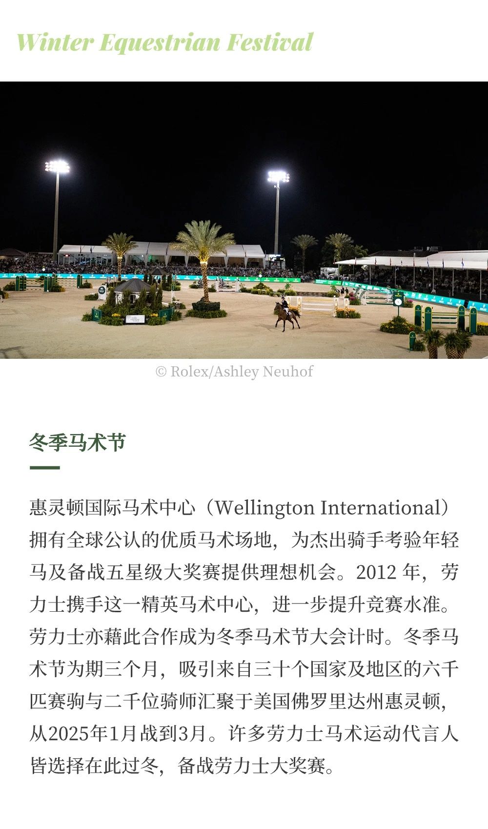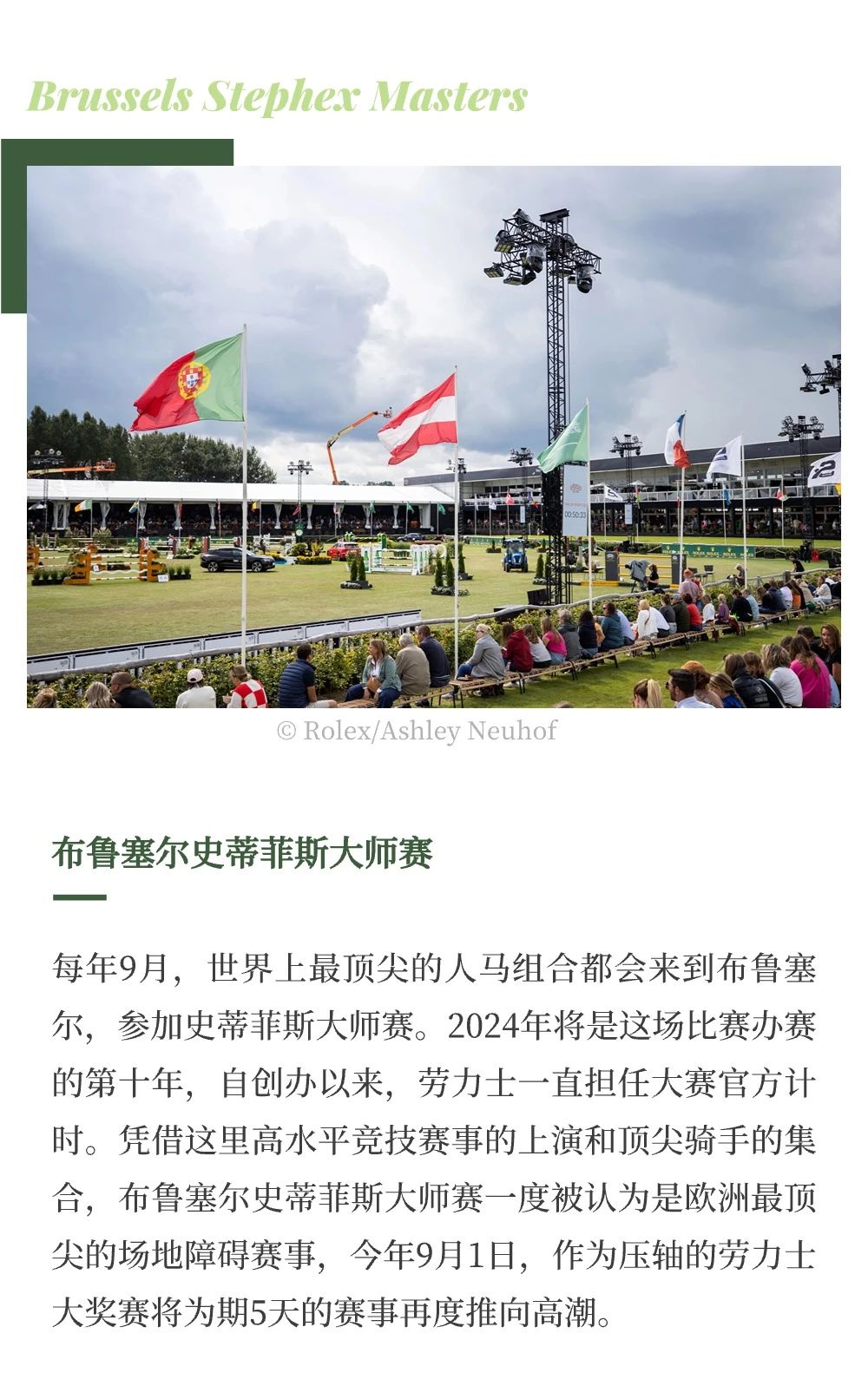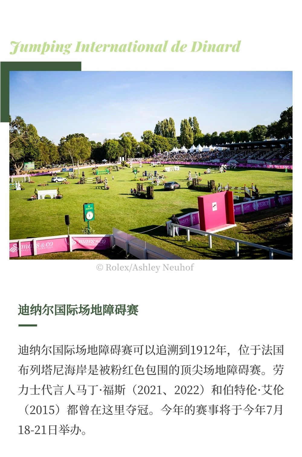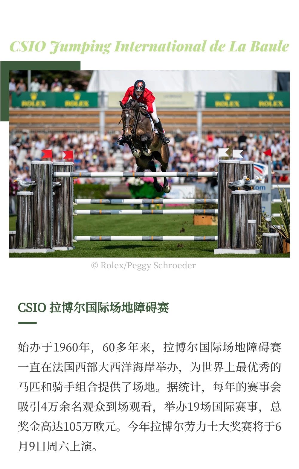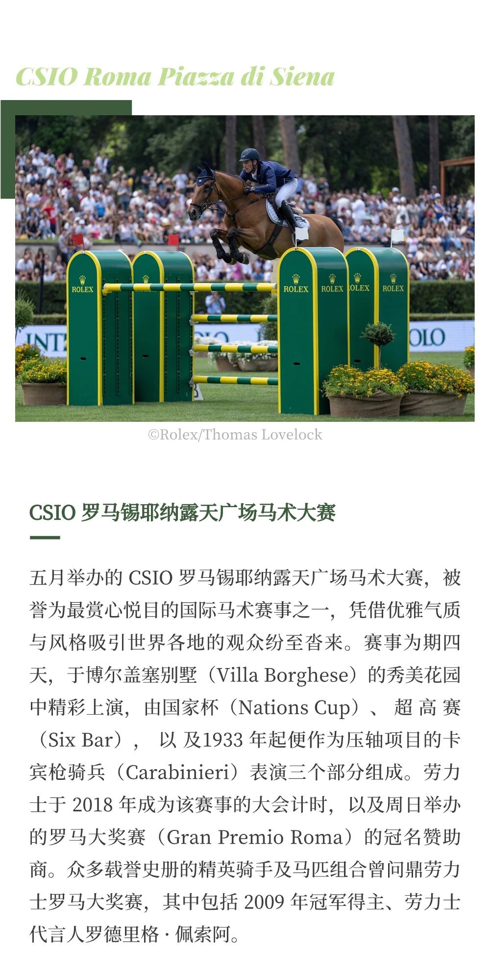 羅馬當(dāng)?shù)貢r(shí)間5月23日,勞力士官宣推出最新馬術(shù)系列賽事——?jiǎng)诹κ肯盗匈悾≧olex Series),聯(lián)合世界飽負(fù)盛名的6場(chǎng)馬術(shù)賽事,代表最高競(jìng)技水平,開(kāi)啟場(chǎng)地障礙挑戰(zhàn)的新紀(jì)元。本周末在意大利舉辦的 CSIO 羅馬錫耶納露天廣場(chǎng)馬術(shù)大賽(CSIO Roma Piazza di Siena)作為勞力士系列賽的第一站,將見(jiàn)證第一名系列賽冠軍的誕生。 除此之外,系列賽還包含法國(guó)的 CSIO 拉博爾國(guó)際場(chǎng)地障礙賽(CSIO Jumping International de La Baule)、法國(guó)的迪納爾國(guó)際場(chǎng)地障礙賽(Jumping International de Dinard)、愛(ài)爾蘭的都柏林馬展(Dublin Horse Show)、比利時(shí)的布魯塞爾史蒂菲斯大師賽(Brussels Stephex Masters)和美國(guó)惠靈頓舉行的冬季馬術(shù)節(jié)(Winter Equestrian Festival)。 |