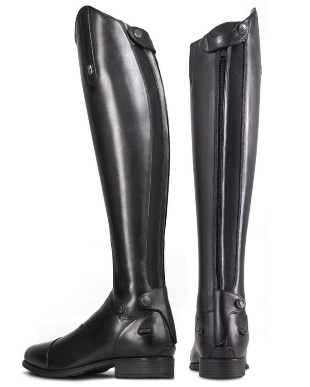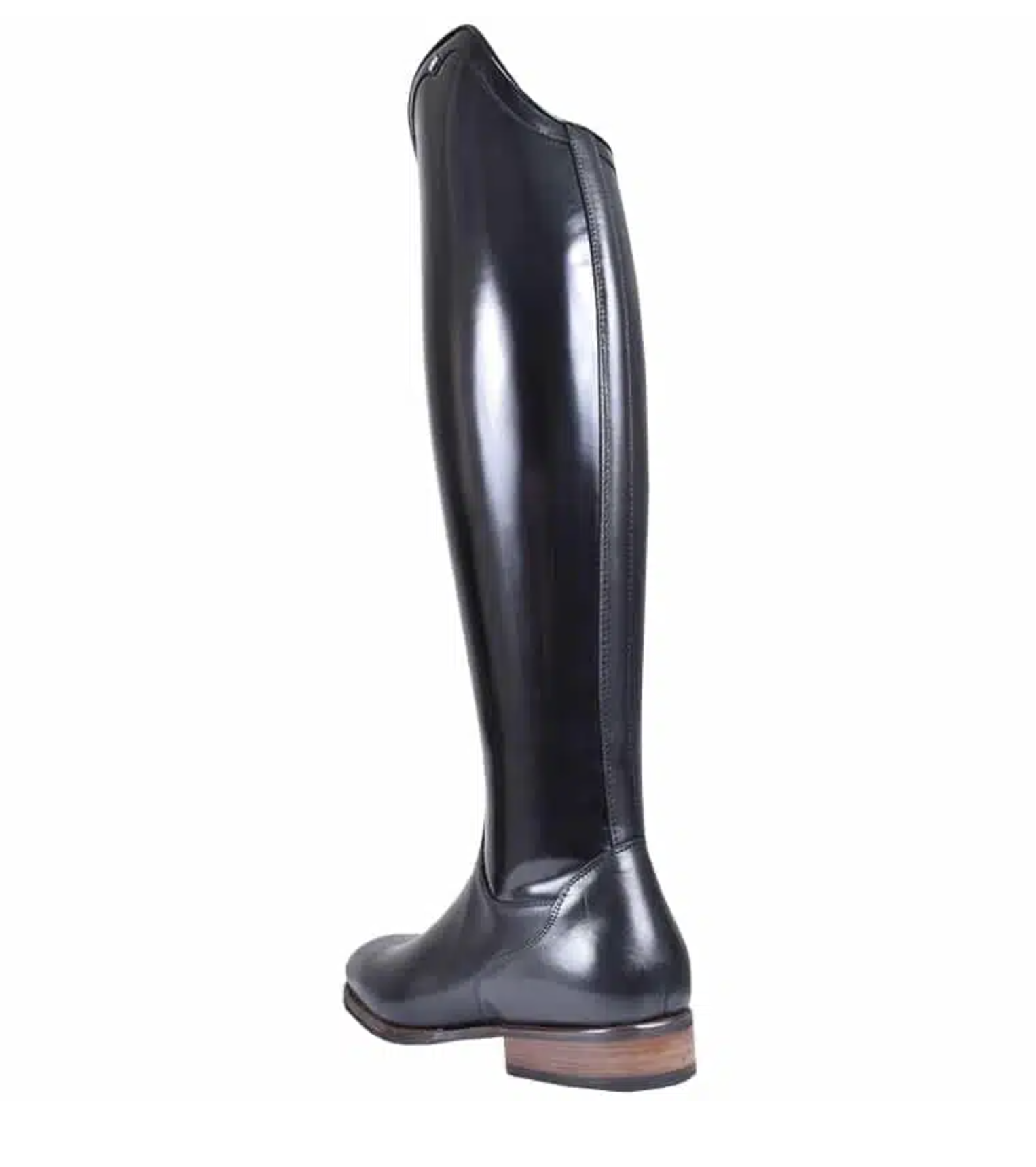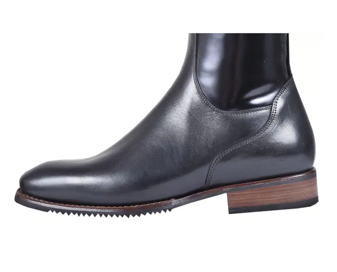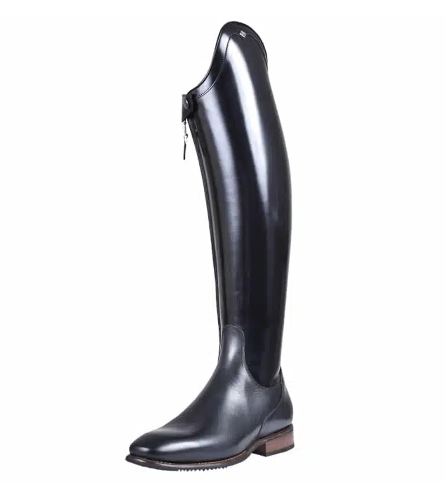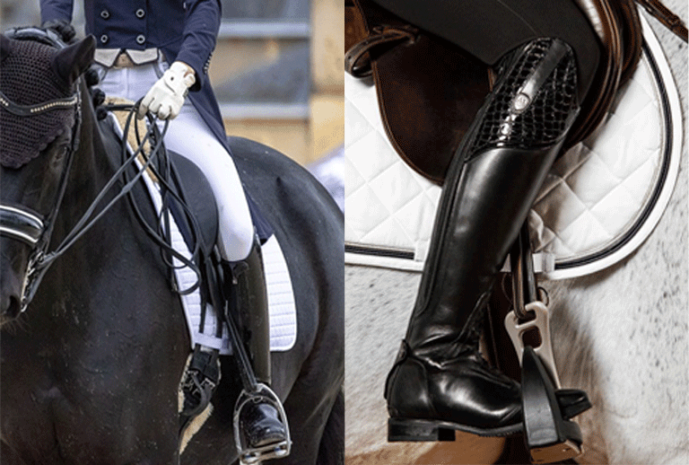 當你第一次踏上馬背,才發(fā)現(xiàn)一雙靠譜的馬靴不僅關乎帥氣,更關乎安全與舒適。在馬術項目中,騎乘靴的合腳度、材質選擇與細節(jié)配置直接影響騎手的表現(xiàn)與舒適度。尤其在多變的訓練與比賽環(huán)境中,這些細節(jié)往往成為決定騎乘體驗的關鍵。 每一環(huán)節(jié)都需綜合考慮運動特性與個人習慣。只有科學配置與細致養(yǎng)護,才能讓馬靴在賽場內(nèi)外持續(xù)提供可靠支持,助力騎手與馬匹的默契配合。每一處配置都藏著提升騎乘表現(xiàn)的關鍵。 盛裝舞步靴 在盛裝舞步中,馬匹和騎手需要使用最少的輔助工具,完美地完成一系列預先設定的動作。為了讓騎手專注于節(jié)奏、規(guī)律性、放松以及與馬匹的互動,舒適且結實的靴子是至關重要的。 盛裝舞步靴后部設有加固結構,并采用不同硬度的皮革制成,因此踝部不會出現(xiàn)明顯的下垂或褶皺?!盁焽枋健痹O計能夠支撐騎手在馬鐙中相對平坦的腳部位置,并保持修長優(yōu)雅的腿部姿勢,從而最大程度地與馬匹的側身接觸。