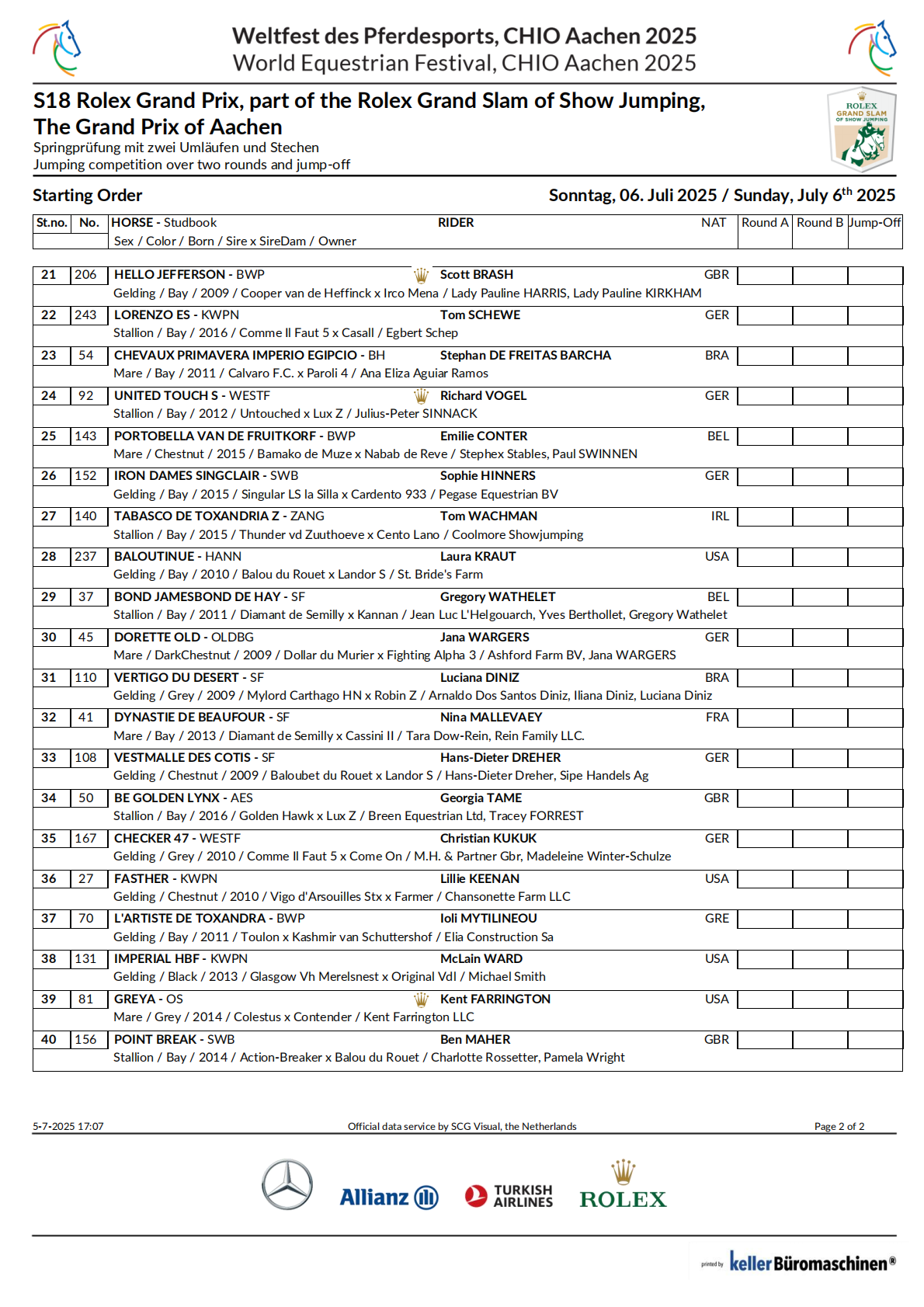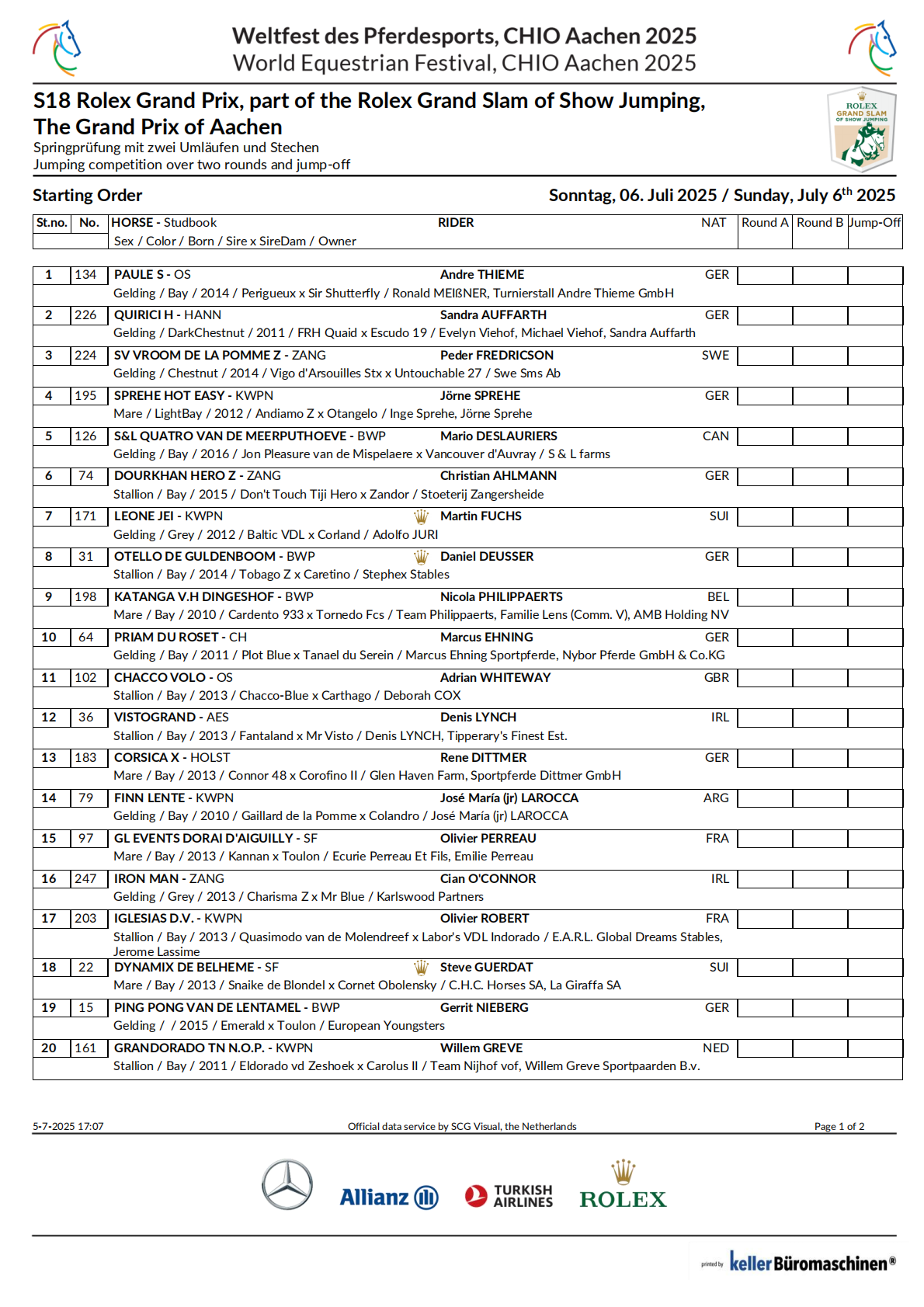 每年七月,當馬蹄聲響起,亞琛這座德國小城便成為全球馬術的焦點。這里有最激烈的場地障礙賽,也有最優(yōu)雅的盛裝舞步,還有馬與交響樂的夢幻融合。對無數(shù)騎手和馬術迷而言,亞琛不僅是一場比賽,更是一種榮耀與信仰。 作為勞力士場地障礙賽大滿貫四站中的重要一站,亞琛世界馬術節(jié)的勞力士大獎賽是最扣人心弦的賽事。來自世界各地的40對頂尖人馬組合將齊聚一堂(完整參賽名單見文末),競逐這項榮耀。最終誰將摘得桂冠?在評論區(qū)打出你看好的選手,今晚19:10,馬術在線直播間,讓我們一起揭曉答案! ———————————————————— 亞琛世界馬術節(jié) 勞力士大獎賽 競猜活動 參與條件 點擊關注【馬術在線】公眾號 (關注后參與才有效哦) 并在【馬術在線】公眾號評論區(qū)留言預測 冠亞季軍或冠軍國家 關注+留言+猜對 就有機會獲獎! 競猜截止時間: 7月6日19:10 (過期無效、以第一次留言為準) 獎項一:“馬術大預言家” 獲獎規(guī)則 首次猜中冠亞季軍的參與者 將獲贈由 犀騰 Hit-Air 充氣護甲 贊助支持 的「奧斯維護甲」一件 (價值4980元) 獎項二:“心有靈犀預言家” 獲獎規(guī)則 首次猜中冠軍的參與者 將獲贈由 Hello Horse 贊助支持的 「長靴」一件 (價值1880元) 獎項三:“國家奇妙預言家” 獲獎規(guī)則 首次猜中冠軍所在國家的參與者 將獲贈由 YAGYA 贊助支持的 「遮陽帽」一件 (價值800元) ———————————————————— 掃描上方二維碼,添加小助手微信 社群互動等你來! |