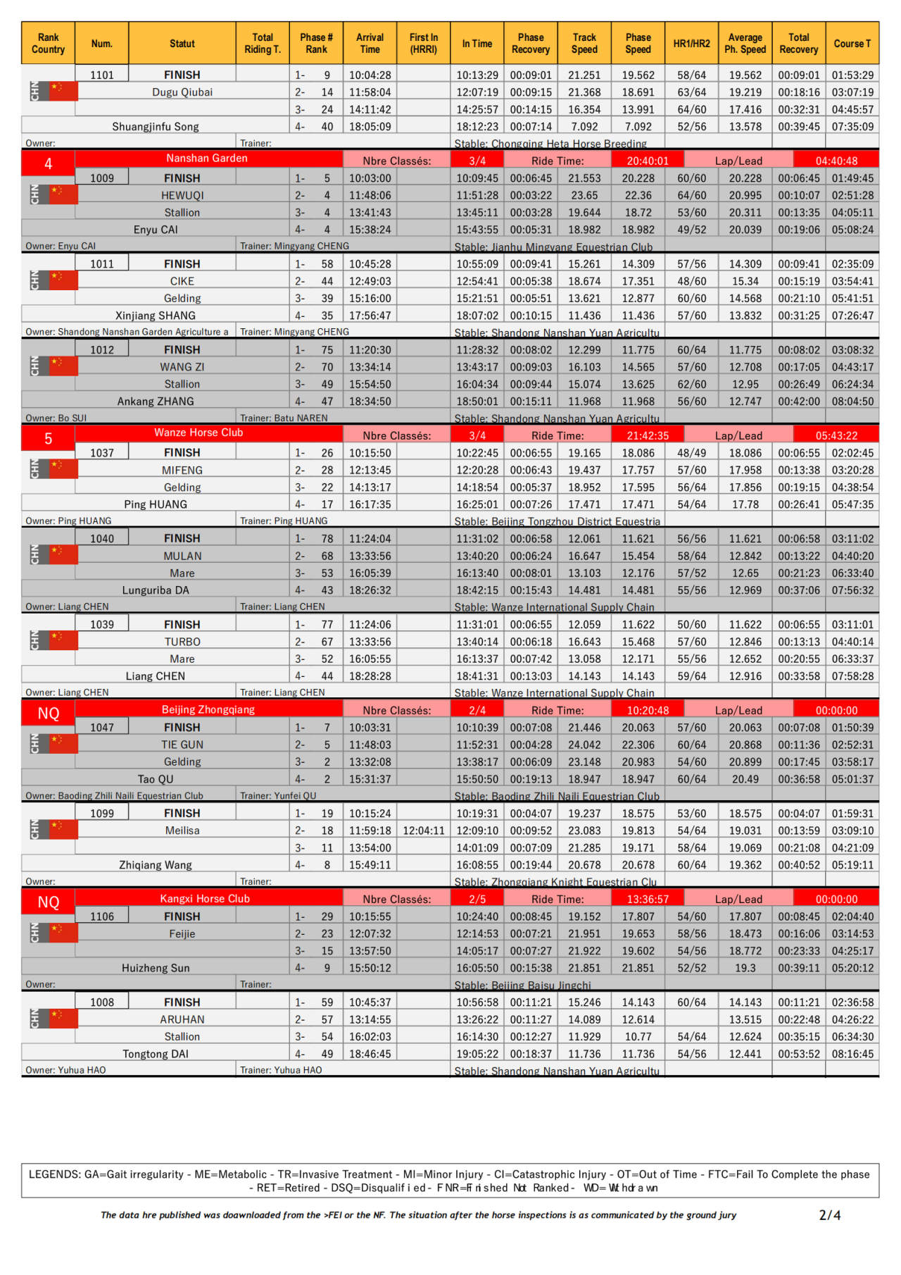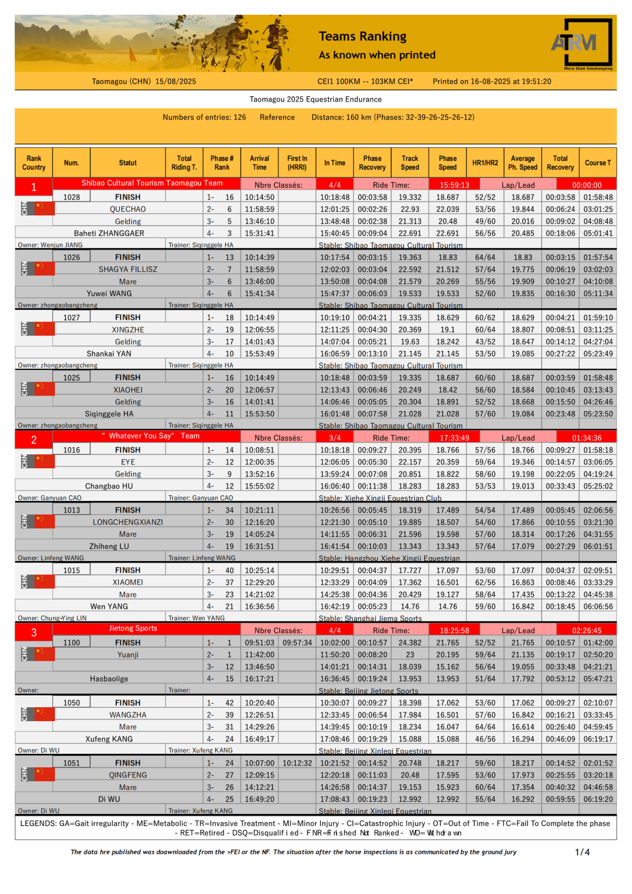8月17日,全國馬術(shù)耐力錦標(biāo)賽暨國際馬聯(lián)(FEI)二星級馬術(shù)耐力賽在內(nèi)蒙古自治區(qū)包頭市達(dá)茂聯(lián)合旗套馬溝田園綜合體正式開賽。 120KM錦標(biāo)賽&國際馬聯(lián)CEI2* CIM 來自北京京馳馬會的騎手石夢慈(騎手號:2026)搭檔“煥影”一路領(lǐng)先,在賽段3時排名短暫落后到第二,隨后在賽段4重新回到第一,以19.5km/h的平均時速完賽,拿下了本場賽事的冠軍。 來自直隸馬會的騎手瞿云飛(騎手號:2016)搭檔“我來了”和來自克什克騰旗烏蘭布統(tǒng)馬會的騎手魏金昆(騎手號:2012)搭檔“哈里”分別落后冠軍15秒和18秒,以同樣19.5km/h的平均時速獲得亞軍和季軍。 120KM錦標(biāo)賽&國際馬聯(lián)CEI2* CIM賽頒獎典禮 頒獎嘉賓:中國馬術(shù)協(xié)會副秘書長、 競賽部部長孫立生先生(右二) 今年16歲的石夢慈接觸耐力賽一年,與“煥影”共同訓(xùn)練了1個月,她表示,這次的賽道較難,對自己和馬來說都有一定挑戰(zhàn)性。此次奪冠,她非常感謝北京京馳馬會強大的后援團,也特別感謝父母的支持與陪伴。 石夢慈接受采訪 賽后數(shù)據(jù)顯示,冠軍石夢慈與“煥影”在完成比賽各賽段后,心率恢復(fù)到規(guī)定標(biāo)準(zhǔn)所需的時間為全場最短;季軍魏金昆搭檔“哈里”在賽段4達(dá)到了24.6km/h的全場最高時速。 8月16日團體賽成績公布 石寶文旅套馬溝隊獲得100KM錦標(biāo)賽團體冠軍,隊員包括:丈嘎爾·巴合提(搭檔“雀巢”)、王玉偉(搭檔“瑞雪”)、嚴(yán)山凱(搭檔“行者”)和哈斯青格樂(搭檔“小黑”)。 |