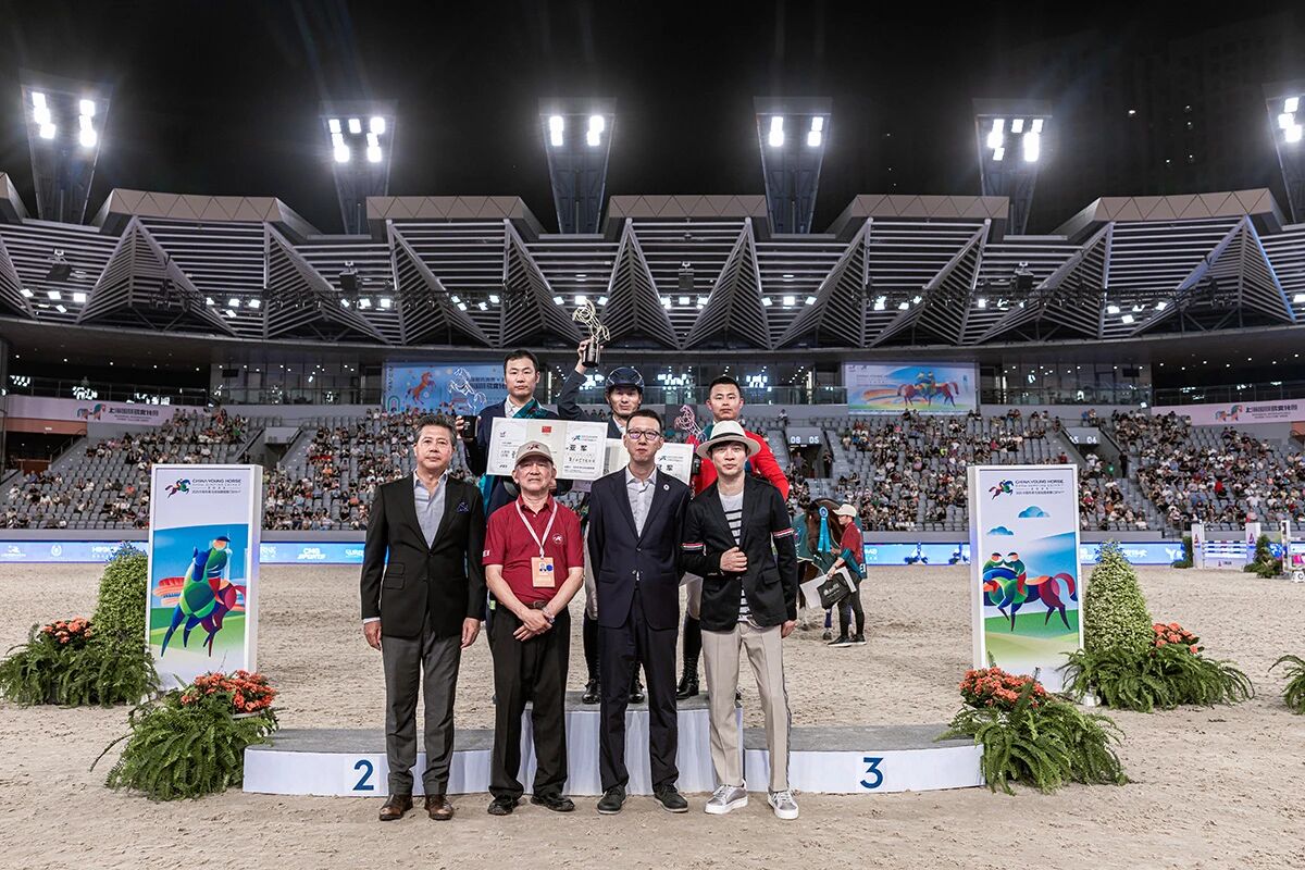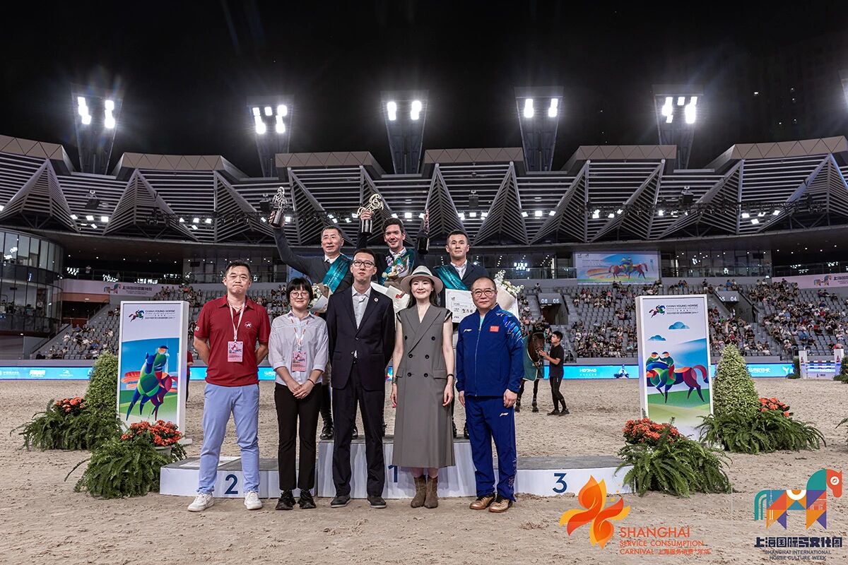 決賽開啟,難度提升 在10月6日下午的六歲馬決賽中,天色漸暗,賽場(chǎng)周圍的LED屏對(duì)于馬匹注意力的影響比上午大很多,這也為現(xiàn)場(chǎng)的馬與騎手帶來了更高的考驗(yàn)。 調(diào)教師通常會(huì)關(guān)注年青馬的專注度、現(xiàn)場(chǎng)表現(xiàn)力、性格等,因此現(xiàn)場(chǎng)比賽經(jīng)驗(yàn)不夠多的年青馬,如果能展現(xiàn)很好的天賦、穩(wěn)定的發(fā)揮和跳躍能力,即便是在有打桿的情況下,也會(huì)被視作有潛力的馬。 最后,張勇搭檔“青澀女孩”以零罰分、75.38秒的行進(jìn)時(shí)間,獲得六歲馬決賽的冠軍。騎手滿都呼搭檔“養(yǎng)樂多”獲得亞軍,騎手高曉坤搭檔“阿克琉斯”獲得季軍。 賽后,張勇在接受馬術(shù)在線采訪時(shí)表示,非常高興這次能夠來上海參加中國(guó)年青馬場(chǎng)地障礙賽,往年的每一屆年青馬大賽我都會(huì)參加。久事的場(chǎng)地條件非常好,也很國(guó)際化,不過對(duì)于沒有太多參賽經(jīng)驗(yàn)的年青馬來說,在較為封閉的場(chǎng)館里比賽會(huì)有些膽怯。 “因?yàn)槲移綍r(shí)也做一些年青馬的調(diào)訓(xùn)工作,所以這次我?guī)Я?匹馬過來參賽,5、6、7歲的馬匹都有。對(duì)于年青馬來說,最重要的是關(guān)注它們的身心健康,不要一味地追求成績(jī),而是通過多參加賽事來增加它們關(guān)于比賽的快樂經(jīng)歷,同時(shí)促進(jìn)它們成長(zhǎng)?!?/span> “年青馬是我們國(guó)內(nèi)彌補(bǔ)年青馬調(diào)教方面的一個(gè)很好的賽事,我希望中國(guó)年青馬場(chǎng)地障礙賽能夠持續(xù)辦下去,我也一定會(huì)每年都參加。”張勇笑著總結(jié)道。 七歲馬決賽的路線難度再次提升,例如,增加了一個(gè)雙橫木很小角度接ABC組合障礙。來自西班牙的騎手薩烏爾·普爾圖斯(Saul Portos)搭檔馬匹“N YANDRO”首先登場(chǎng),全程將馬控制在柔和、完美的節(jié)奏中,馬匹自身也會(huì)在跳躍障礙時(shí)有意識(shí)收緊前腿與后腿,這種對(duì)于障礙的小心性是年青馬可貴的品質(zhì)之一。 擁有豐富年青馬調(diào)訓(xùn)經(jīng)驗(yàn)的中國(guó)騎手劉同晏隨后搭檔“要塞中心”出場(chǎng),也順利以零罰分完賽,與薩烏爾·普爾圖斯進(jìn)入附加賽。最終,兩對(duì)人馬組合各獲得4分障礙罰分,薩烏爾·普爾圖斯搭檔“N YANDRO”以2.23秒的領(lǐng)先優(yōu)勢(shì),奪得冠軍。劉同晏搭檔“要塞中心”取得亞軍,周小毛搭檔“星月”獲得季軍。 薩烏爾·普爾圖斯對(duì)馬術(shù)在線記者說:“這是我第一次在中國(guó)參加年青馬大賽,我來中國(guó)已經(jīng)六年了,在這期間我見證了中國(guó)馬術(shù)產(chǎn)業(yè)的發(fā)展。在歐洲,馬匹繁育是馬術(shù)產(chǎn)業(yè)里很重要的一環(huán),年青馬賽事也會(huì)有很多騎手帶著馬匹參加。如今,看到中國(guó)自主繁育的馬匹越來越多,年青馬場(chǎng)地障礙賽也成為亞洲首個(gè)國(guó)際馬聯(lián)認(rèn)證的年青馬賽事,這對(duì)于中國(guó)馬術(shù)未來的發(fā)展肯定是很好的,我也非常高興能夠參與到其中?!?/span> “今天我搭檔的七歲馬匹‘N YANDRO’是我的學(xué)生Angelina zimo Bian的馬,我和這匹馬配合有一年了,它在比賽中非常專注,總是盡它所能表現(xiàn)到最好,在今天比賽中的表現(xiàn)也非常好。我很希望在未來繼續(xù)參與年青馬賽事,這類賽事無論是對(duì)馬還是對(duì)人來說,都有極大的幫助?!?/span> 決賽頒獎(jiǎng)儀式 最佳調(diào)教師:劉同晏 頒獎(jiǎng)嘉賓:瑪尚馬具總經(jīng)理劉華華(左一);著名演員、歌手景崗山(右一)。 最佳馬工:盤雪潤(rùn) 頒獎(jiǎng)嘉賓:天駟龍駒賽事管理有限公司高級(jí)顧問、中國(guó)年青馬大賽賽事發(fā)起人欒樹(左一);瑪尚馬具總經(jīng)理劉華華(右一)。 六歲馬級(jí)別決賽頒獎(jiǎng):張勇搭檔“青澀女孩”奪得冠軍(后中),滿都呼搭檔“養(yǎng)樂多”榮獲亞軍(后左),高曉坤搭檔“阿克琉斯”獲得季軍(后右)。 頒獎(jiǎng)嘉賓:中國(guó)電影表演藝術(shù)學(xué)會(huì)副會(huì)長(zhǎng)、上海電影家協(xié)會(huì)副主席、上影演員劇團(tuán)團(tuán)長(zhǎng)、國(guó)家一級(jí)演員佟瑞欣(左一);技術(shù)官員代表、賽事監(jiān)管長(zhǎng)葉謀順(Mou soon Yap)(左二);上海久事國(guó)際馬術(shù)有限公司董事長(zhǎng)洪磊(右二);著名歌手、音樂制作人、中國(guó)首位獲得國(guó)際歌唱比賽最高獎(jiǎng)的流行歌手羅中旭(右一)。 七歲馬級(jí)別決賽頒獎(jiǎng):SAUL PORTOS 搭檔“N YANDRO”奪得冠軍(后中),劉同晏搭檔“要塞中心”榮獲亞軍(后左),周小毛搭檔“星月”獲得季軍(后右)。 頒獎(jiǎng)嘉賓:中國(guó)馬術(shù)協(xié)會(huì)競(jìng)技部部長(zhǎng)賈大鵬(左一);技術(shù)官員代表、賽事裁判長(zhǎng)沈曉玥(左二);上海久事國(guó)際馬術(shù)有限公司董事長(zhǎng)洪磊(左三);著名演員、柏林電影節(jié)銀熊獎(jiǎng)最佳女主角、中國(guó)電影金雞獎(jiǎng)最佳女主角詠梅(右二);中國(guó)乒乓球運(yùn)動(dòng)員、奧運(yùn)會(huì)冠軍、世界冠軍王濤(右一)。 CSIYH1*2025年中國(guó)年青馬場(chǎng)地障礙賽作為亞洲首個(gè)真正意義上的國(guó)際年青馬賽事,不僅為其他亞洲國(guó)家提供了重要范本,更向公眾彰顯了中國(guó)在馬術(shù)領(lǐng)域的長(zhǎng)期承諾:中國(guó)既關(guān)注騎